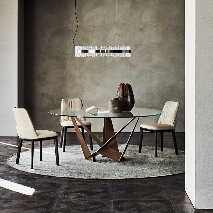 Стол с основанием из титана (GFM11), бронзы (GFM18), графита (GFM69), белой (GFM71) или черной (GFM73) лакированной стали с тиснением, матовой бронзы или матовой серой. Столешница из ореха Каналетто (NC) или обожженного дуба (RB), из прозрачного или сверхпрозрачного стекла со скошенными краями 15 мм. Версия ø140 см с деревянным верхом включает балласт на основании. Дополнительный центральный поворотный поднос Lazy Susan.Характеристики