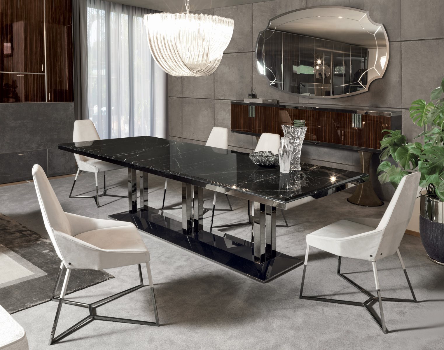 Стол из шлифованного металла, вырезанного лазером. Отделка рамы: ярко-коричневый оттенок, яркое светлое золото, матовое золото цвета шампанского, глянцевый хром, глянцевый черный хром, матовая сатинированная бронза, золото Black Rose.Верхняя отделка: Мрамор (толщина 20 мм) толщиной 20 мм. фаска: мрамор Fusion Light, мрамор Patagonia, мрамор Explosion Blu, мрамор Fusion Multicolor, кварцевый мрамор Juliet, мрамор Sahara Noir (полиэфирная отделка), мрамор Dover White, мрамор Panda White, мрамор Guatemala Green, мрамор Corteccia, мрамор Port Saint Laurent, красный Мрамор Levanto, мрамор Bardiglio Nuvolato, мрамор Elegant Brown, мрамор Shale Rosewood, мрамор Emperador Dark, мрамор Silver Wave, мрамор Agatha Black, мрамор Frappuccino, мрамор Calacatta Gold. Закаленное стекло толщиной 20 мм. фаска в цветах: черный лак 10 мм, бронза или дымчатое зеркало 6 мм.