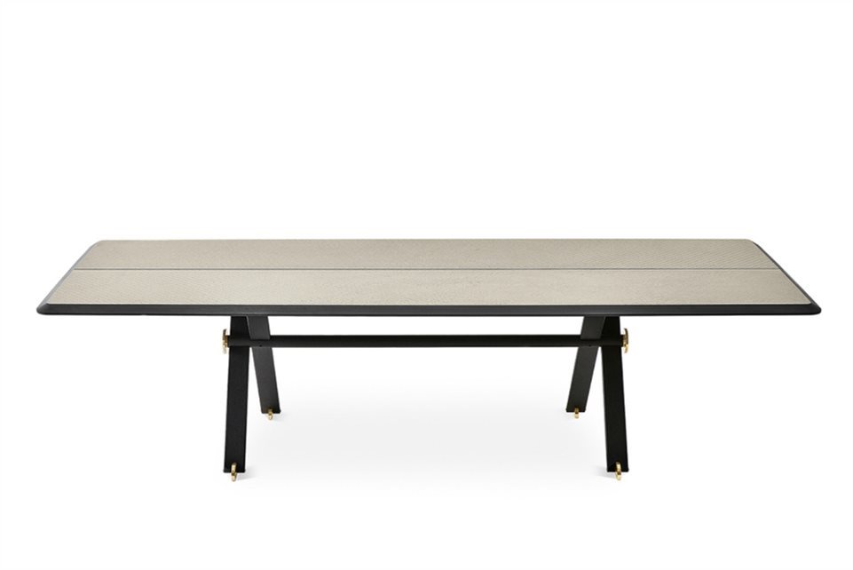 Стол с черной структурой из анодированного алюминия, отполированного вручную. Яркие латунные детали. Ламинированный топ со скосом из мрамора Bianco Statuario и Nero Marquinia. Также доступен в инкрустированном деревянном топе с рисунком «твид». 15-миллиметровая окрашенная стеклянная столешница со скошенной кромкой по образцу в яркой или сатинированной версии, по запросу.Характеристики