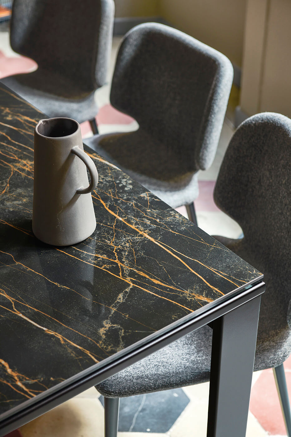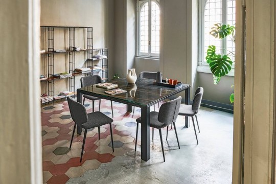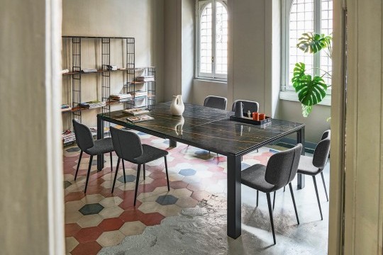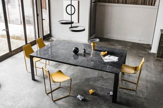 Расширяемый стол на четырех ножках из лакированной стали. Верх и расширение из стекла или кристаллической керамики.Характеристики