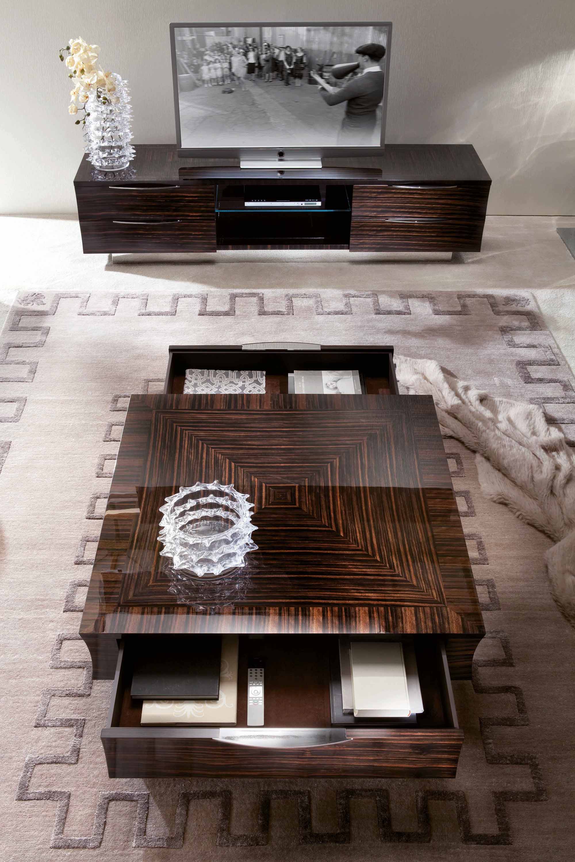 Квадратный деревянный коктейльный столик из шпона макассарское эбеновое дерево с атласной отделкой. 2 ящика полного выдвижения с бархатным дном. 2 ручки и основание из нержавеющей стали.Характеристики
