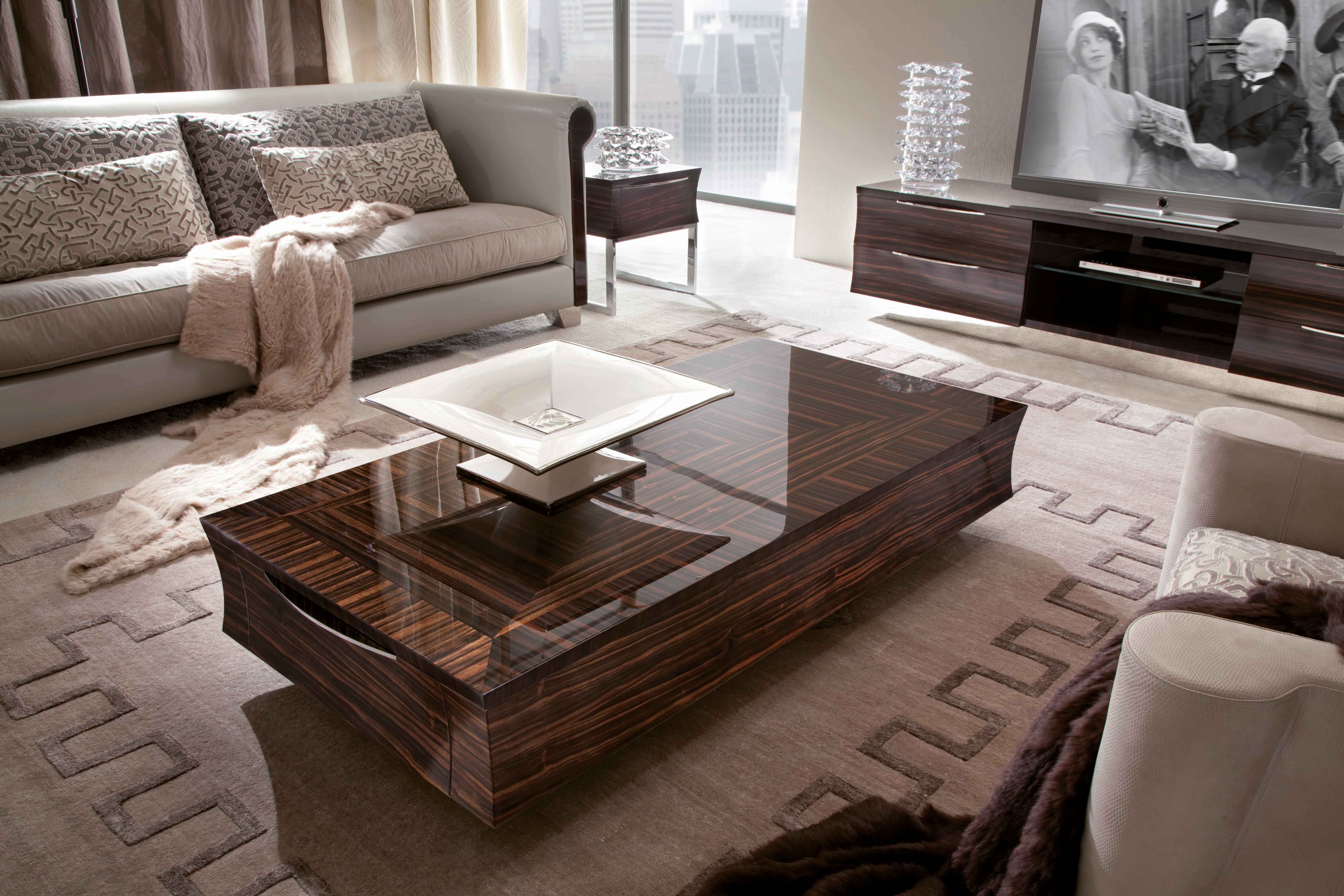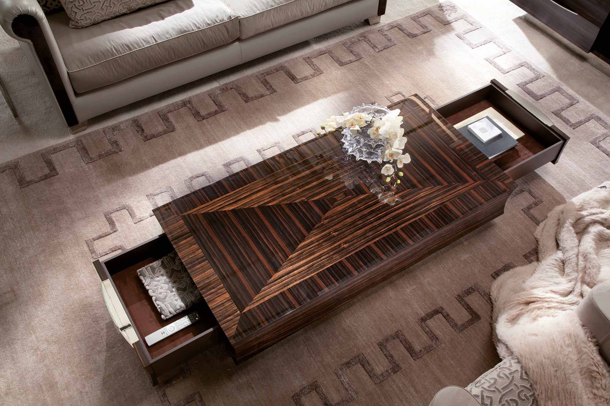 Прямоугольный деревянный коктейльный столик из шпона макассарское эбеновое дерево с атласной отделкой. 2 ящика полного выдвижения с бархатным дном. 2 ручки и основание из нержавеющей стали.Характеристики
