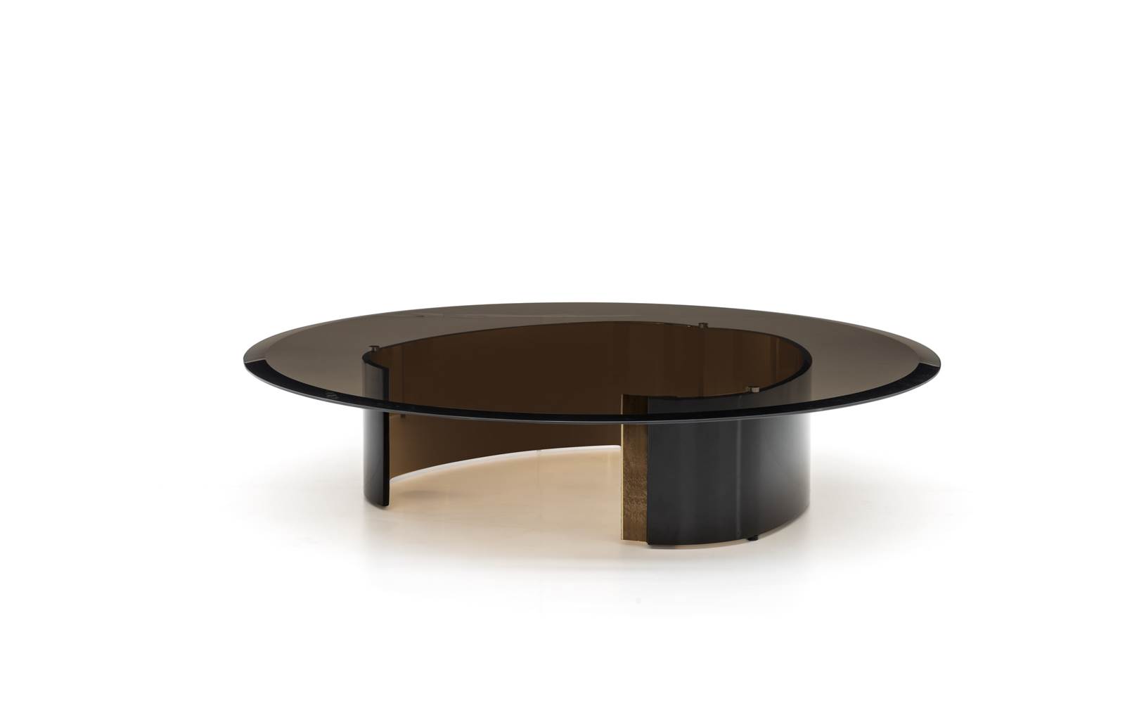 Форма основания видна через элегантную столешницу из круглого, квадратного и прямоугольного бронзового стекла с изящной фаской по краю.