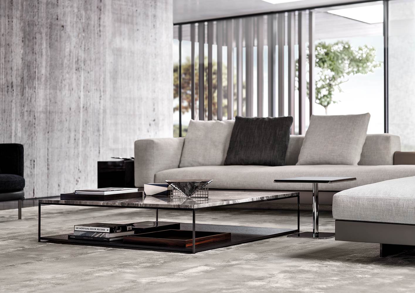 Благодаря чистым линиям, изысканным материалам и изысканной отделке, Liam применяет архитектурный подход к дизайну, выраженный в его рациональных формах.Семейство журнальных столиков Liam отличается воздушной квадратной стальной конструкцией размером 1 см, которая образует легкий объем, определяемый полированной отделкой цвета олова. В нем есть столешница из мрамора Calacatta, мрамора Grigio Orobico, черного стекла pâte de verre или матового дуба с отделкой лаком цвета Moka. В некоторых элементах он также имеет более низкую деревянную поверхность для хранения книг, журналов и других предметов, также из матового дуба с отделкой цветным лаком Moka.