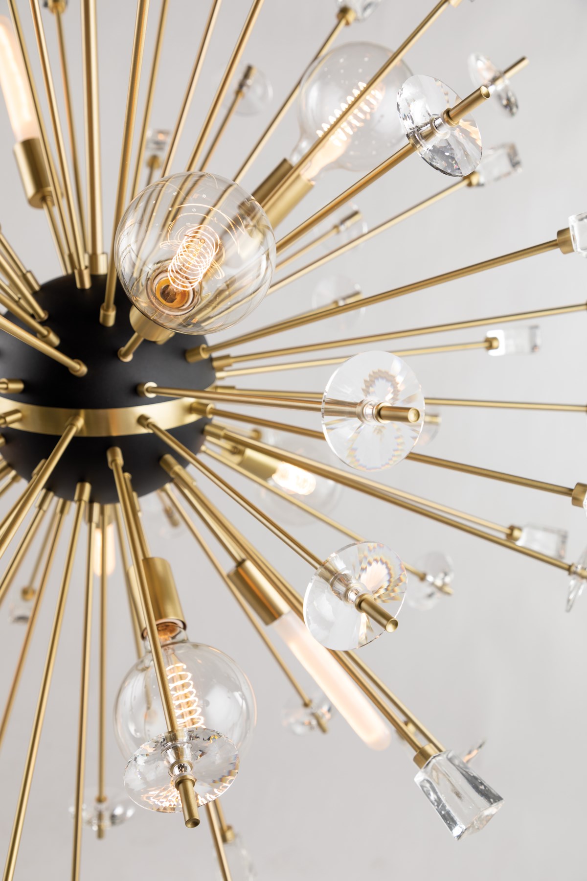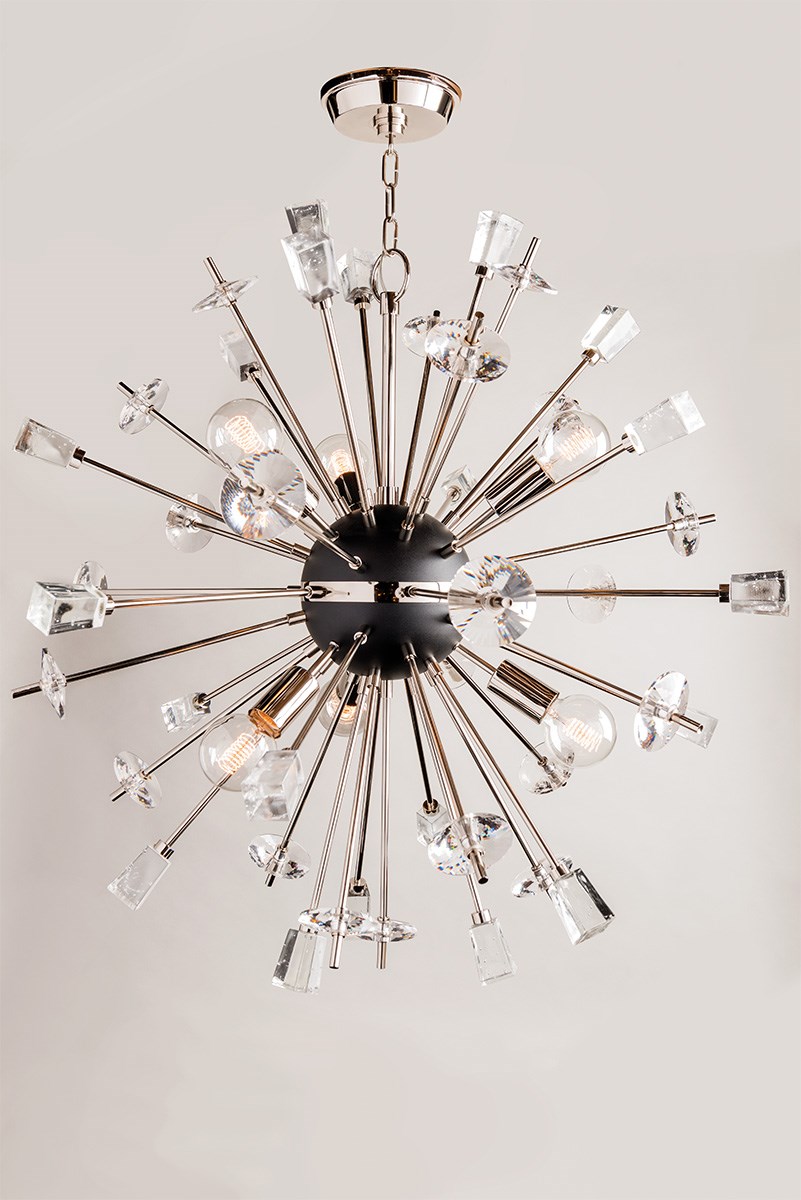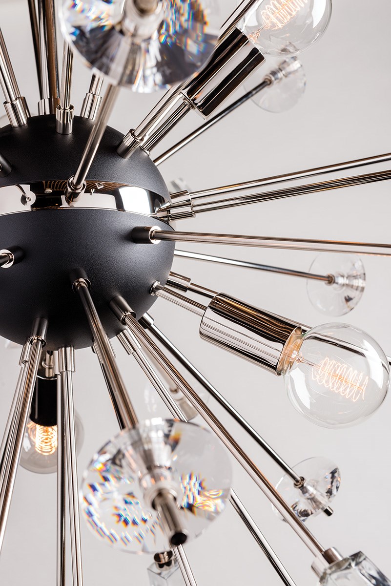 Liberty начинается с сердцевины с матово-черного металла, связанной вокруг его середины с блестящим контрастом от выбранной штуки - латуни или никеля. Ретро катушки в прозрачном стекле, балонуе, создают основной источник света; в больших моделей трубчатые луковицы с открытыми нитями чередуются. Хрустальные диски и ледяное ручное стекло украшают торчащие стержни, заламывая ослепительный свет в тысячах направлениях.Характеристики