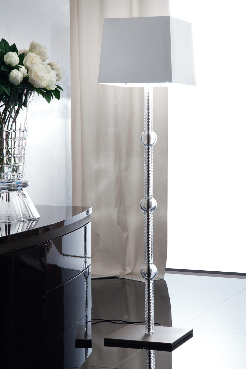 Торшер с цоколем из венецианского стекла "Мурано" и бронзированной нержавеющей стали. Белый атласный шелковый оттенок.Характеристики