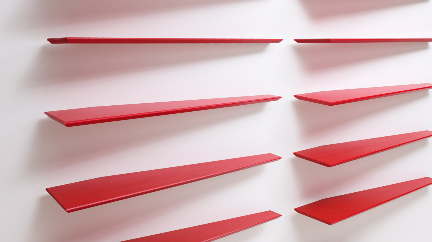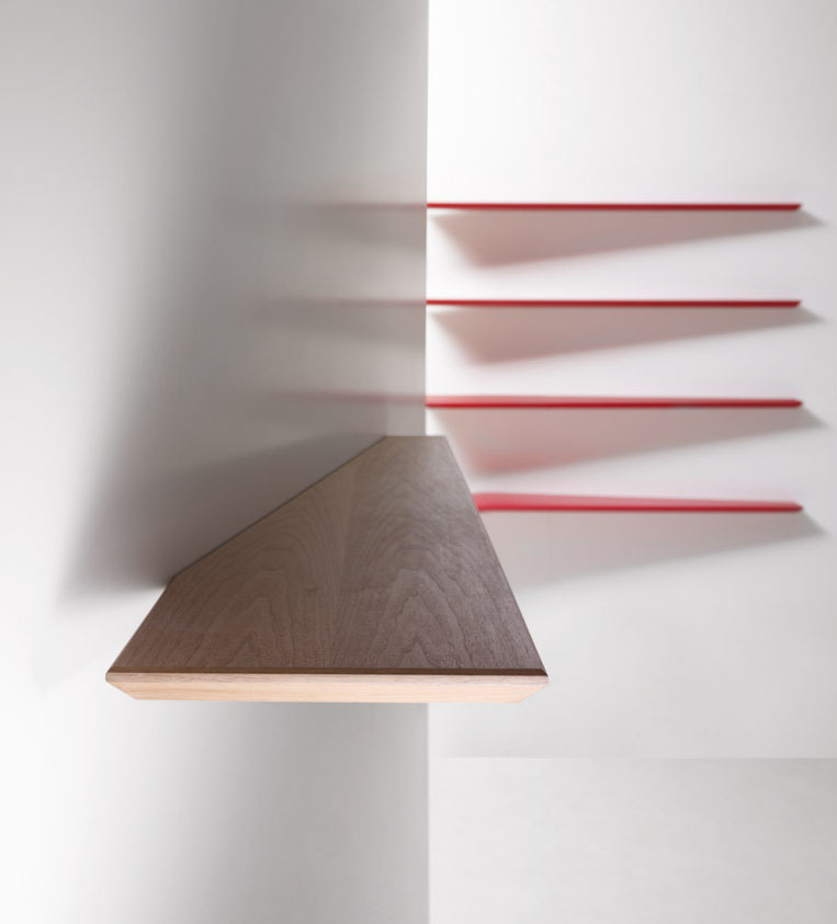 Рон Гілад створює полички з пелюсткового профілю, що проникають у стіну, ставлячи під сумнів наше сприйняття стін і перетворюючи їх на предмети, щоб зачарувати і завоювати нас. Полиці з пастильним периметром, що проникають крізь стіну, ставлять під сумнів наше сприйняття стін. МДФ, покритий різними деревами, невидима підставка для полиці в оцинкованому металі. Випускається також у пофарбованих кольорах. Це частина колекції меблів Ron Gilad Grado °.Характеристики