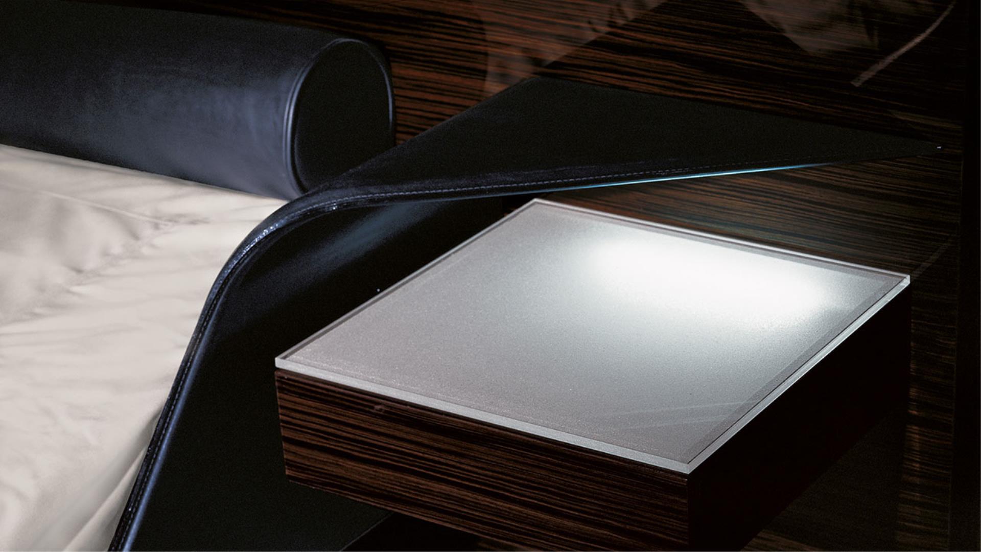 Ліжко з дерев'яним узголів'ям у матовому або блискучому лакованому покритті або в блискучому дереві з чорного дерева. Каркас ліжка, оброблений шкірою Naturale. Металеві ніжки з атласної латуні або титану. Додаткові підвісні бічні столи з 1 висувним шухлядою та верхом у надзвичайно забитому кущовим склом із внутрішнім освітленням.Характеристики