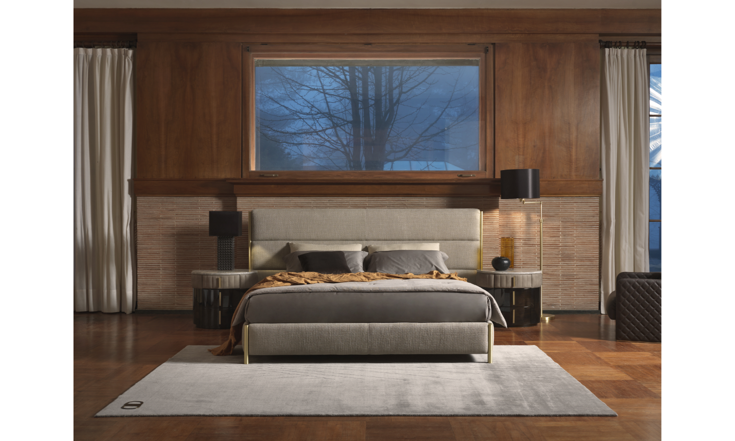 Просте та сучасне ліжко Flag одночасно поєднує суттєвий та вишуканий дизайн. Горизонтальні елементи ліжка, здається, звисають з опорних профілів, як гордий прапор. Конструкція оббита шкірою, нубуковою шкірою або тканиною. Цінні деталі з атласної латуні створюють привабливі точки світла на відміну від м’яких поверхонь, надаючи Прапору вагомі докази рідкісної, романтичної конкретності.Характеристики
