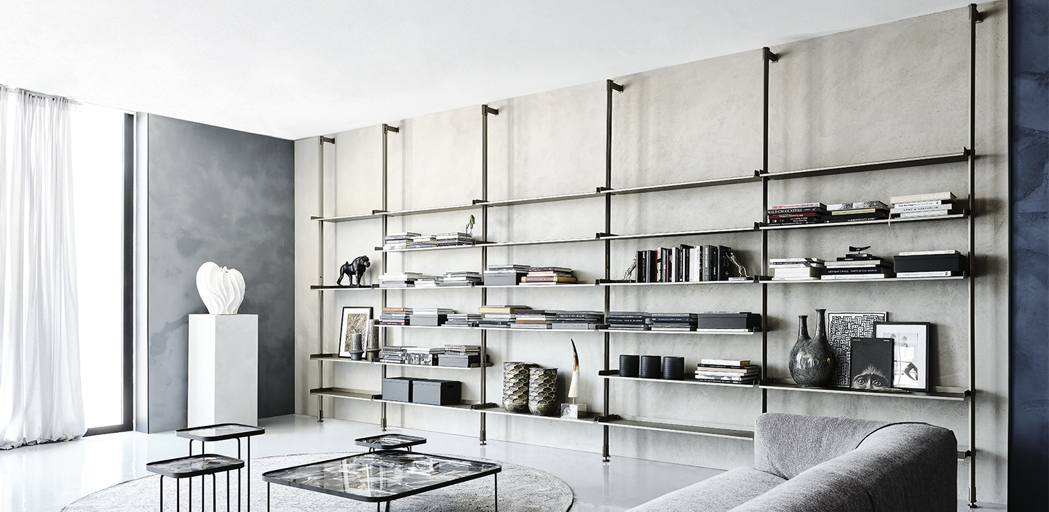 Модульна настінна або стельова книжкова шафа. Кронштейни, стовпи та полиці з титанової (GFM11) або бронзової (GFM18) рельєфної лакованої сталі. Контейнери з титану (GF11) або бронзи (GF18) з рельєфним лакованим деревом та фумірованим склом.Характеристики