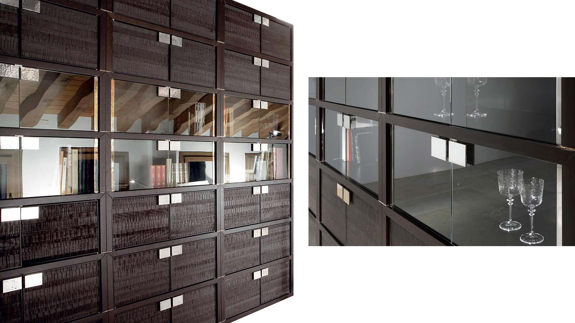 Доступний модульний елемент: відкритий зі скляною спинкою; закрита скляною задньою частиною та скляними дверима; закрита дерев'яною спинкою та дверима. Ручки та опори з матової сталі або срібла. Дозволяє композиції різних розмірів і форм.Характеристики