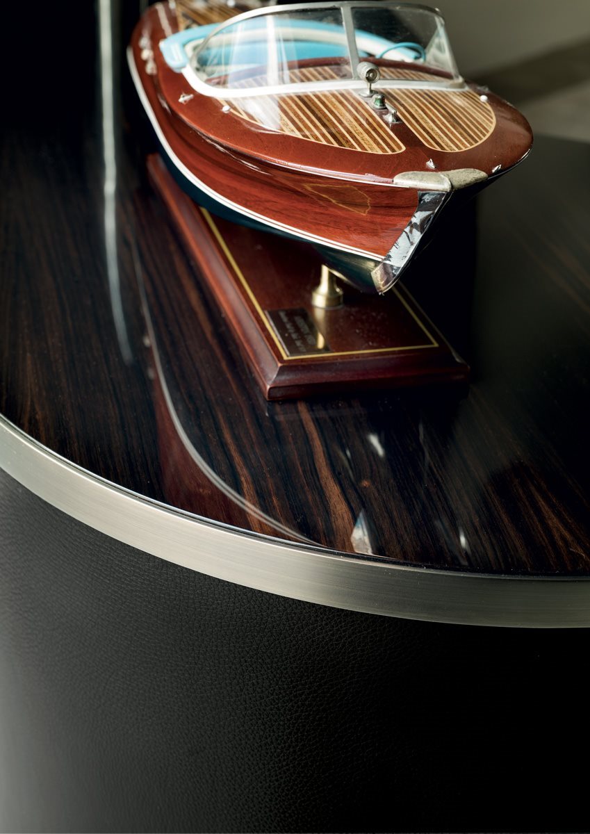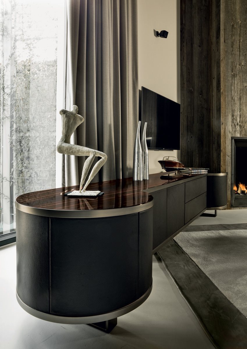 Вітальня з дверима та висувними ящиками та структурою, оббитою шкірою з каталогу або деревом у обробці: Глянцевий / матовий Ebony, глянсовий / матовий фрісе з явору, глянсовий / матовий волоський горіх Canaletto, глянцевий горіх Burl Wood. Краї шліфованого металу в наступній обробці: золото Black Rose, яскраво-рожеве золото, матове рожеве золото, яскраво-затінене коричневе, яскраве світле золото, матове шампанське золото, яскравий хром, яскраво-чорний хром, матова атласна бронза. Структура вигнутих торцевих елементів доступна лише в шкірі з асортименту. Верхня обробка: бронзове або димчасте дзеркало, мармур Сахара Нуар (поліефірне покриття), білий мармур Довер, білий мармур Панда, зелений мармур Гватемали, мармур Corteccia, мармур Порт Сен-Лоран, мармур Червоний Леванто, мармур Бардильо Нуволато, елегантний коричневий мармур, сланцеве палісандр мармур, темний мармур Emperador, мармур Silver Wave, чорний мармур Агати, мармур Frappuccino, мармур Calacatta Gold, мармур Fusion Light, мармур Patagonia, мармур Explosion Blu, мармур Fusion Multicolor, мармур Quarzo Juliet. Або в облицюванні дерева. Відкриваючі механізми та інтер’єри з бронзою. Основу складають металеві ніжки, пофарбовані в бронзу. Внутрішня частина закругленого торцевого елемента та острова яскраво лакована порошковим кольором, є поворотний та обертовий лоток, оббитий шкірою з каталогу (що відповідає структурі), та автоматичне світлодіодне світло.Характеристики