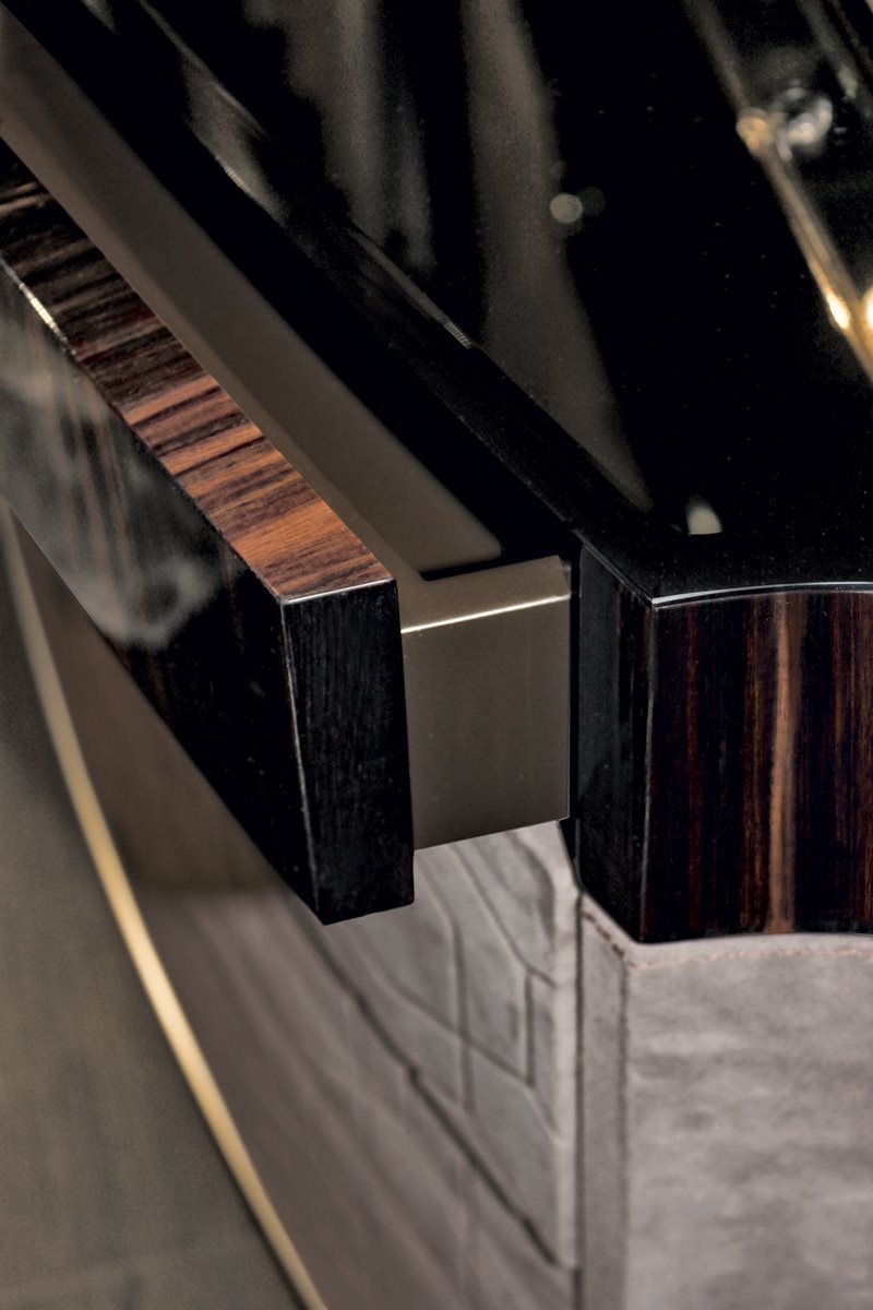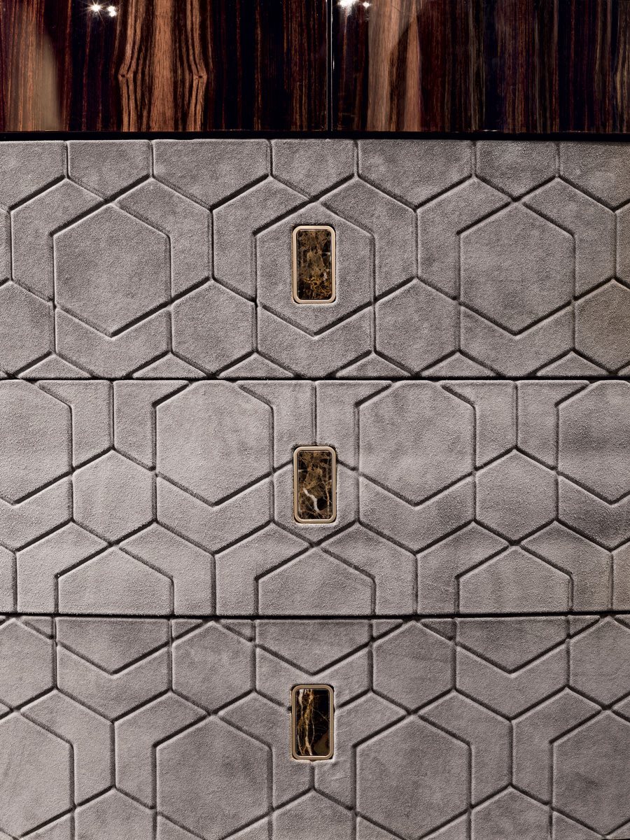 Комод у двох варіантах: для використання біля стіни або як острів. Пропонується повністю оббита шкірою з каталогу або з ящиком під верхом з дерева: глянсовий / матовий фрісе з явору, глянцевий / матовий чорне дерево, глянцеве дерево з горіхового бурла Переднє покриття шухляди з ефектом 3D із піднятою декорацією “Diamond” або “Sequence” доступне лише в асортименті P.3 Suede та Lusso. Обробка верхньої поверхні: 5 мм бронзове або димчасто скошене дзеркало. 20-міліметровий мармур з фаскою 20 мм: мармур Сахара-Нуар (поліефірне покриття), білий мармур Довер, білий мармур Панда, зелений мармур Гватемали, мармур Кортеча, мармур Порт-Сен-Лоран, червоний мармур Леванто, мармур Бардильо Нуволато, елегантний коричневий мармур, мармуровий сланцевий палисандр, Темний мармур Emperador, мармур Silver Wave, чорний мармур Agatha, мармур Frappuccino, мармур Calacatta Gold, мармур Fusion Light, мармур Patagonia, мармур Explosion Blu, багатобарвний мармур Fusion, мармур кварцовий Джульєтта, мармур Calcite Azul. Металеве кільце в наступній обробці: золото чорного троянди, яскраво відтінене коричневе, яскраве світле золото, матове шампанське золото, яскравий хром, яскраво-чорний хром, матова атласна бронза, яскраво-рожеве золото, матове рожеве золото. Ручки для змиву з металу, із вставкою з мармуру, вибраною серед зразків, висувні ящики з двотактним механізмом відкриванняХарактеристики