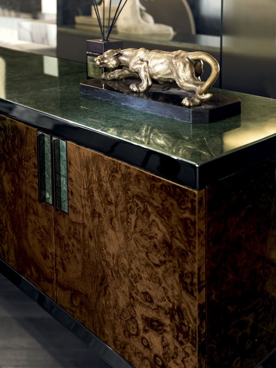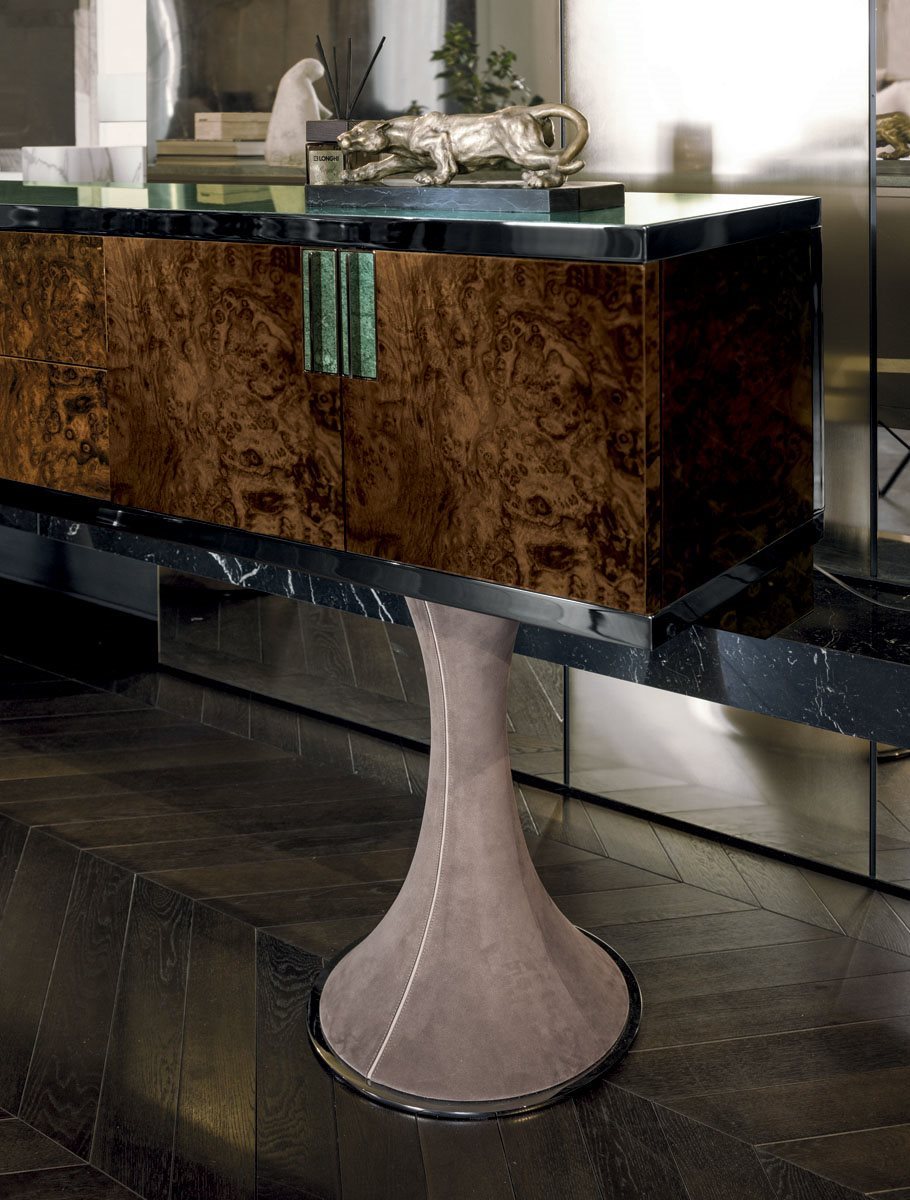 Серія шаф з гіперболоїдною формою основи зі скловолокна, з внутрішньою структурою з пофарбованого металу, покрита шкіряною гамою. A / B - Шафа з дерева або шкіри: Дерев'яна шафа: глянцевий / матовий чорне дерево, глянсовий / матовий волоський горіх Canaletto, глянсовий / матовий фрісе з явору, глянцевий дерево з горіхового бурла. Двері з того ж дерева, що і конструкція шафи, або покриті шкірою з асортименту. Інтер'єр покритий кішкою. P.3 Замшева шкіра, шафа обладнана висувним ящиком з металевою передньою частиною та центральною полицею з прозорого загартованого скла 8 мм. Заднє в нейтральному дзеркалі. Освітлення світлодіодною стрічкою з можливістю затемнення. Сенсорний вимикач включає світло. Ручки з металу зі вставкою з мармуру з діапазону. Краї та нижня пластина з металу у обробці: золото чорної троянди, яскраво затінене коричневе, яскраве світле золото, матове шампанське золото, яскравий хром, яскраво-чорний хром, матова атласна бронза, яскраво-рожеве золото, матове рожеве золото. 4-міліметровий бронзовий або димчастий верх дзеркала зі скосом.Характеристики