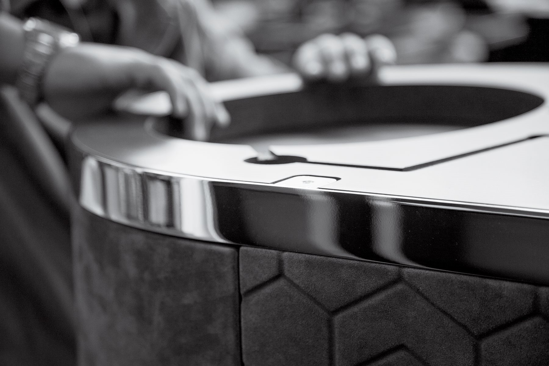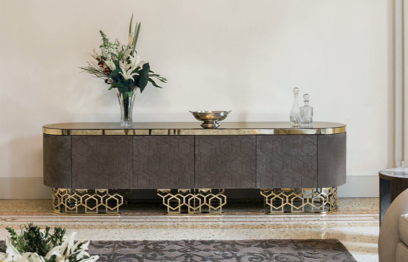 Шафа для вітальні повністю оброблена шкірою з категорій в асортименті. Внутрішня обробка з темного пофарбованого дерева зебрано. Основа з каландрованого лазерного різаного шліфованого металу з оздобленням “Sequence” у таких обробках: золото чорного троянди, яскраво затінене коричневе, яскраве світло золото, матове шампанське золото, яскравий хром, яскраво-чорний хром, матова атласна бронза, яскраво-рожеве золото, матове рожеве золото. Краї в шліфованому металі в тому ж обробці, що і основа. Необов’язково: можна вставити світильник зі скляним розсіювачем лише на полицю. 3D покриття дверей рельєфним оздобленням «Алмаз» або «Послідовність» можливе лише на шкірі P.3 зі шкіри Cat. Замша та люссо. Оздоблення полиць: бронзове або димчасте дзеркало 5 мм зі скошеним краєм. Мармур товщиною 20 мм зі скосом мм 20: мармур Portoro, мармур Sahara Noir (поліефірне покриття), білий мармур Dover, білий мармур Panda, мармур Green Guatemala, мармур Corteccia, мармур Port Saint Laurent, червоний мармур Levanto, мармур Bardiglio Nuvolato, елегантний коричневий мармур, сланцевий мармуровий мармур, мармур Emperador темний, мармур Silver Wave, чорний мармур Агата, мармур Frappuccino, мармур золота Калакатта, мармур Fusion Light, мармур Patagonia, мармур Explosion Blu, мармур Fusion Multicolor, кварцовий мармур Джульєтти.Характеристики