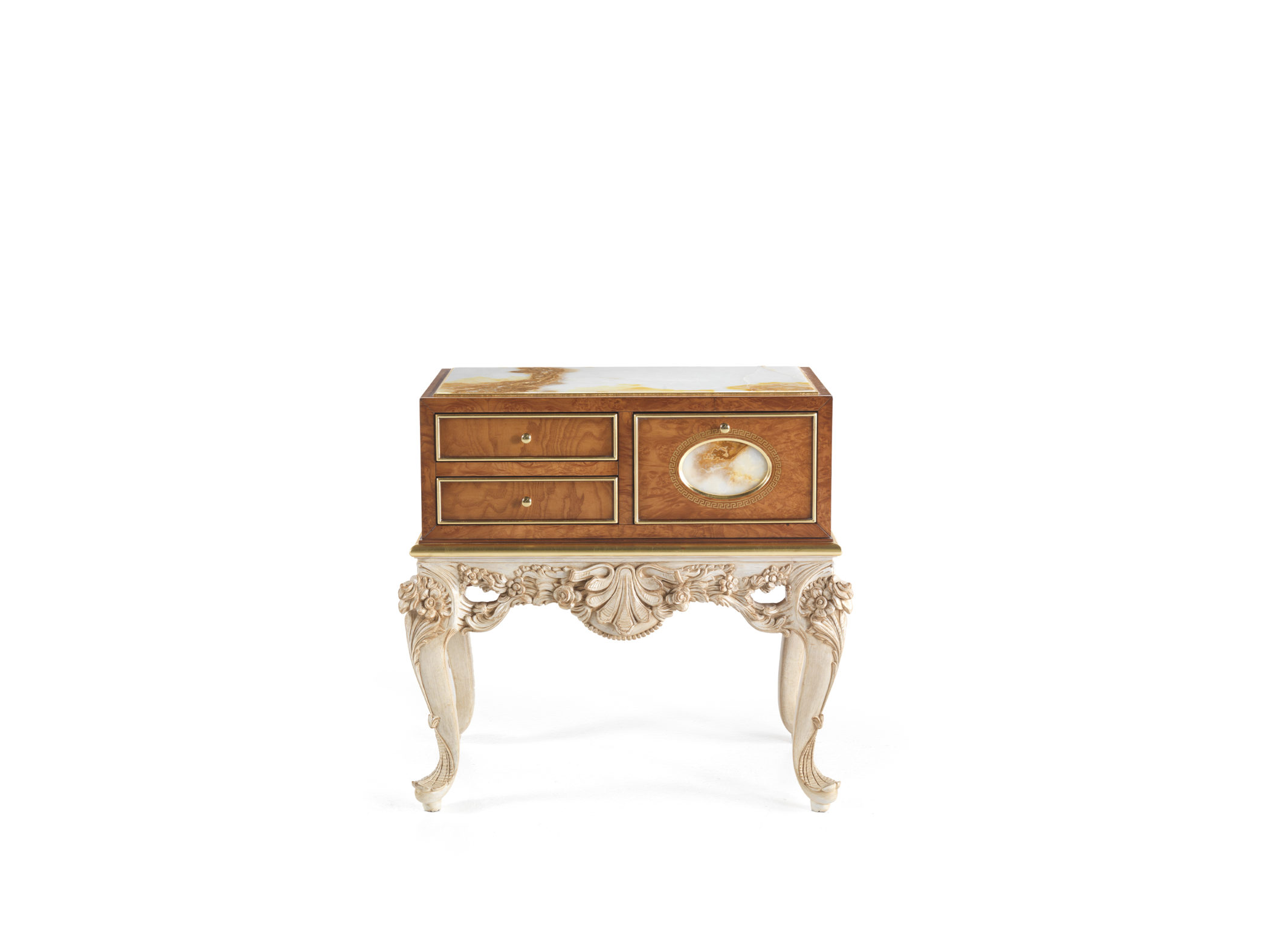 Основа з різьбленого по дереву вручну з обробкою з горіха з патинованим білим і золотим кольорами. Структура з горіха з латунними вкладками. Зверху в зеленому пакистанському оніксі або у фіолетовому оніксі.Характеристики