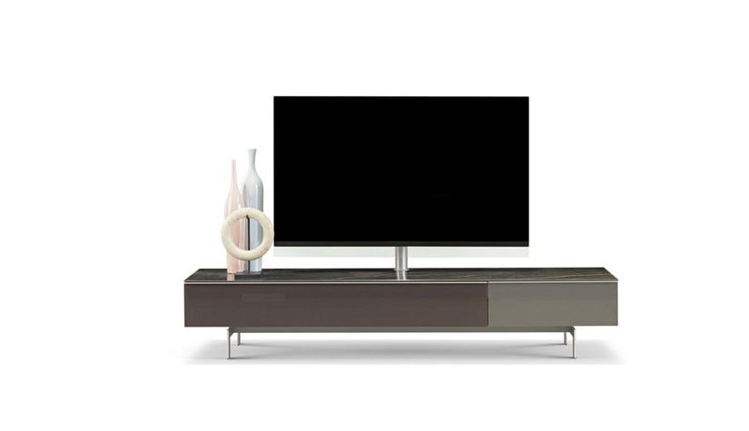 Телевізійний блок, блок зберігання з 1 центральним клапаном з передньою частиною тканини (доступні 4 обробки). Клапті з кожного боку у меламіні (7 обробок). з газовим стисненням. Інтер’єр із звуковою системою *. матова регульована підставка для телевізора. Верхній лоток з кераміки (2 обробки Noir desir або Statuario). Система основи та рукоятки з анодованого алюмінію, система випущена 15,4 смХарактеристики