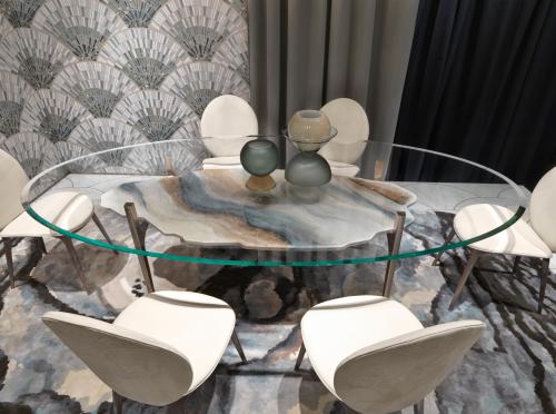 Основна конструкція з литого алюмінію та сталі. Чотири ніжки з забитим покриттям відшліфовані вручну і з'єднані з основною рамою, підтримуючи нижній верх у мармурі. Мармур Crema Marfil обробляється та декорується вручну, створюючи на його поверхні барельєфну мінеральну текстуру, доступну у двох кольорових варіаціях ("Лагуна" або "Тенеріфе"). Верх у надзвичайно прозорому загартованому склі. Металеві деталі можуть бути лаковані в будь-який колір, що входить до вибору металевої обробки.Характеристики