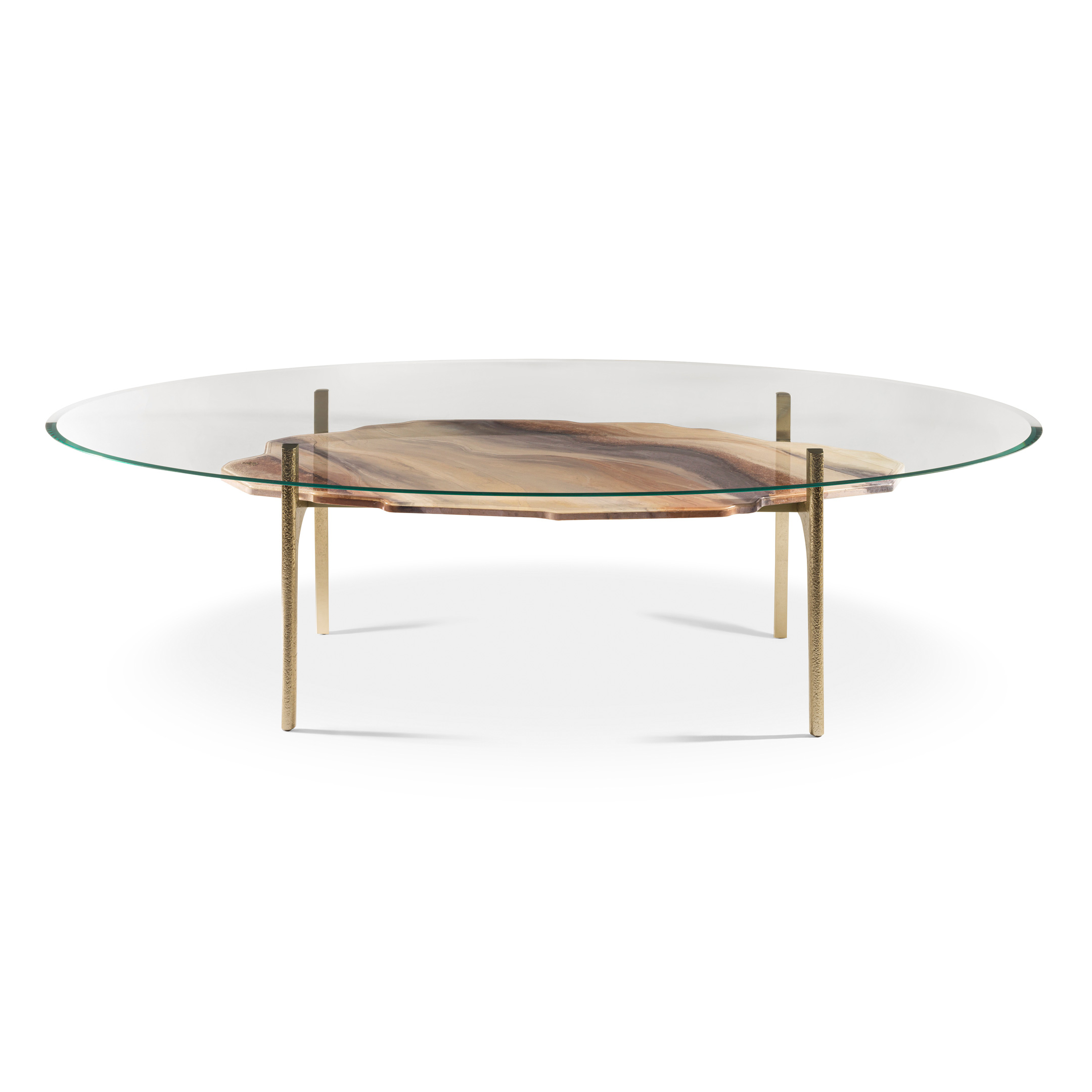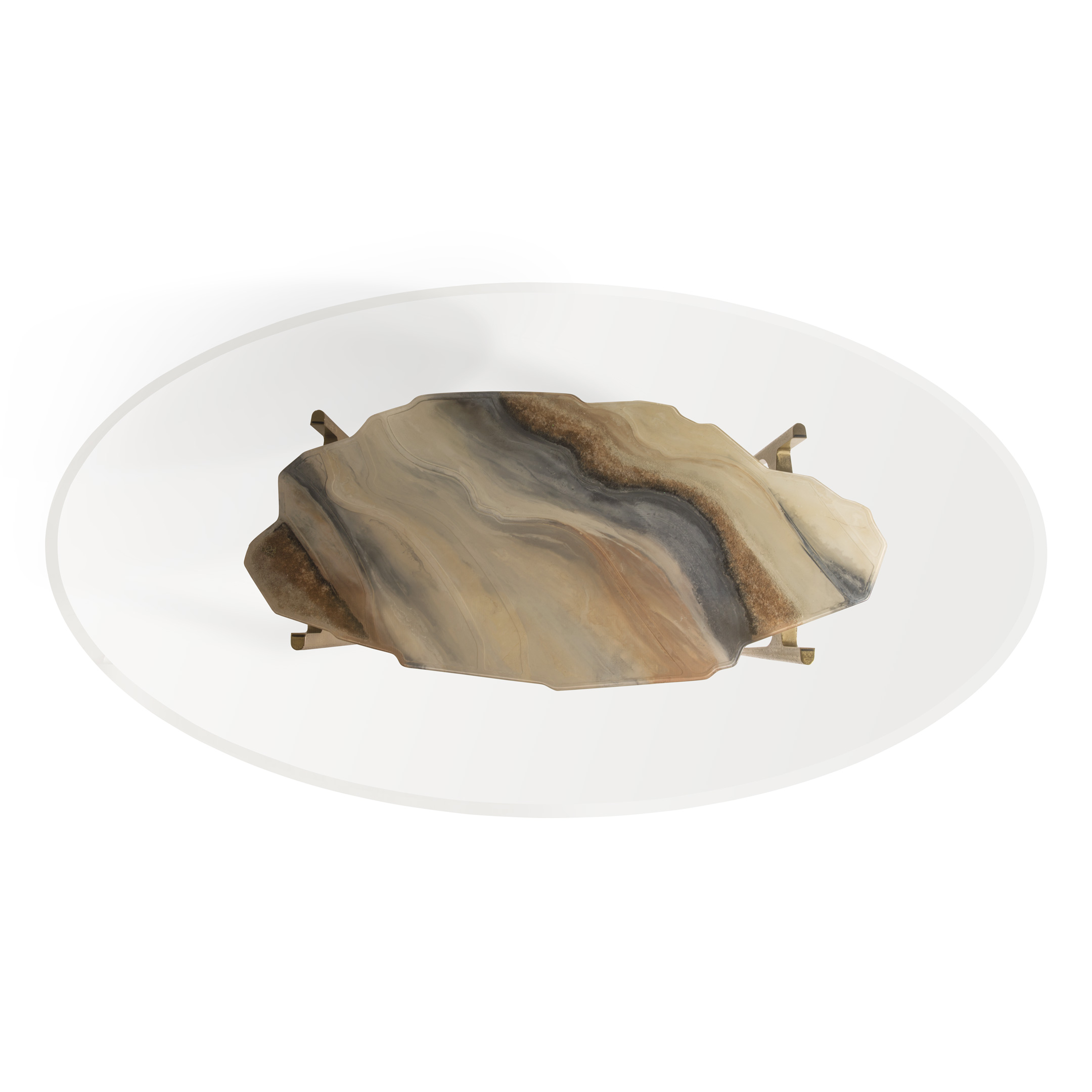 Основна конструкція з литого алюмінію та сталі. Чотири ніжки з забитим покриттям відшліфовані вручну і з'єднані з основною рамою, підтримуючи нижній верх мармуром. Мармур Crema Marfil обробляється та декорується вручну, створюючи на його поверхні барельєфну мінеральну текстуру, доступну у двох кольорових варіаціях ("Лагуна" або "Тенеріфе"). Верх у надзвичайно прозорому загартованому склі. Металеві деталі можуть бути лаковані будь-яким кольором, що входить до складу обробки металу.Характеристики