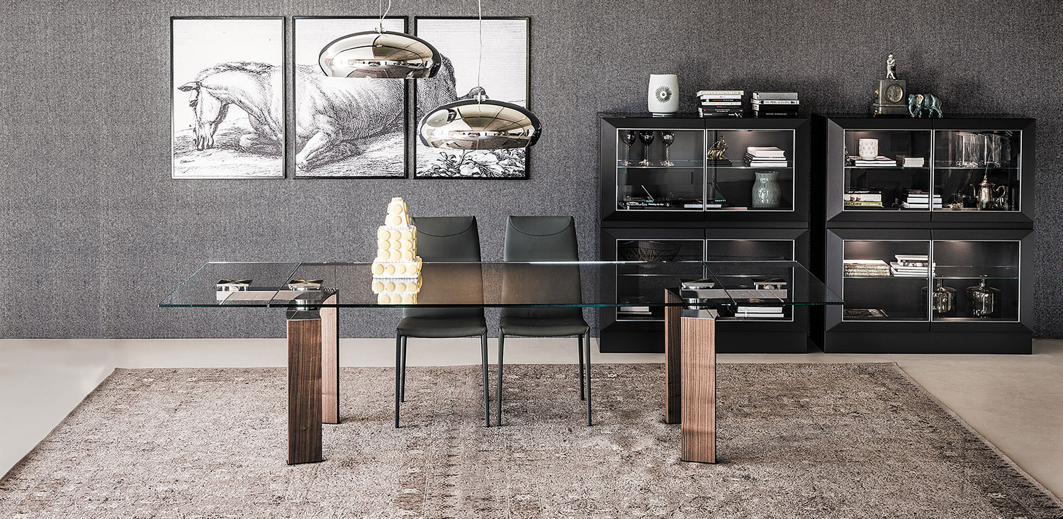Розсувний стіл з ніжками з полірованої нержавіючої сталі або горіха Каналетто (NC). Верх і подовжувачі з загартованого прозорого скла або надзвичайно прозорого скла (верх 15 мм, подовжувачі 12 мм). Полірований механізм з нержавіючої сталі.Характеристики
