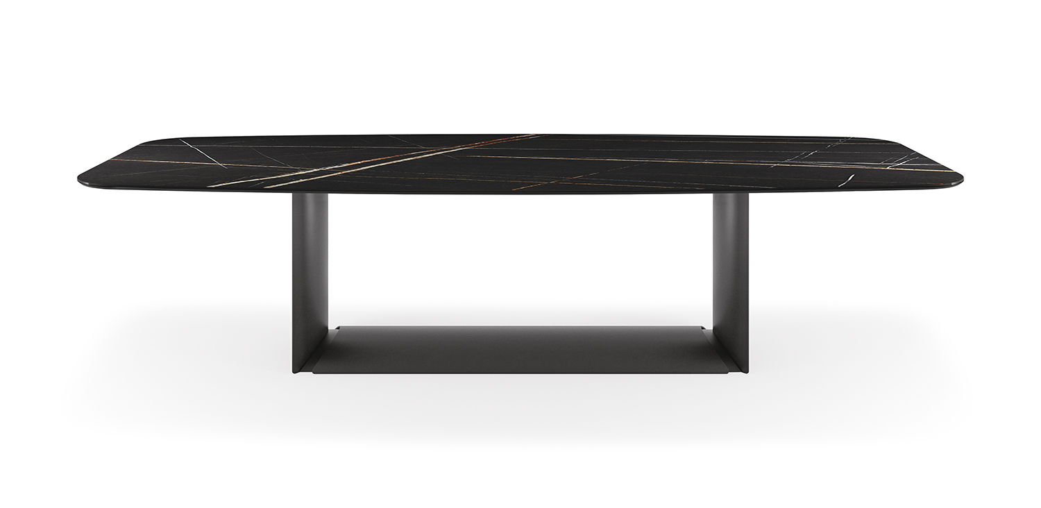 Стіл з титановою (GFM11), бронзовою (GFM18), графітовою (GFM69) або чорною (GFM73) рельєфною основою з лакованої сталі. Верх з кераміки Marmi Alabastro (KM02), Supreme (KM03), Ardesia (KM04), матова Золота Калакатта (KM05), глянсова Золота Калакатта (KM06), матова Порторо (KM07), глянсова Порторо (KM08), глянцева Сахара Нуар (KM09) ), Emperador (KM10), Makalu (KM11), Breccia (KM12) або Arenal (KM13).Характеристики