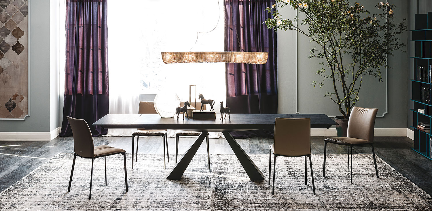 Розсувний стіл з основою з титану (GFM11), бронзи (GFM18), графіту (GFM69), білого (GFM71) або чорного (GFM73) тиснення з лакованої сталі. Керамічний верх і подовжувачі Marmi в Алабастро (KM02), Supreme (KM03), Ардезії (KM04), матова Золота Калакатта (KM05), глянцева Золота Калакатта (KM06), матовий Порторо (KM07), глянцевий Порторо (KM08), глянцевий Сахара Нуар (KM09), Emperador (KM10), Makalu (KM11), Breccia (KM12) або Arenal (KM13).Характеристики