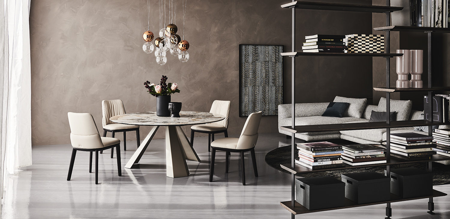 Стіл з основою з титану (GFM11), бронзи (GFM18), графіту (GFM69) білого (GFM71), чорного (GFM73) або тисненої лакованої сталі. Мармі Алабастро (КМ02), Вищий (КМ03), Ардезія (КМ04), матова Золота Калакатта (КМ05), глянсова Золота Калакатта (КМ06), матова Порторо (КМ07), глянсова Порторо (КМ08), глянсова Сахара Нуар (КМ09), Емперадор (KM10), Makalu (KM11), Breccia (KM12) або Arenal (KM13) керамічний верх. Додатковий центральний поворотний лоток Lazy Susan.Характеристики