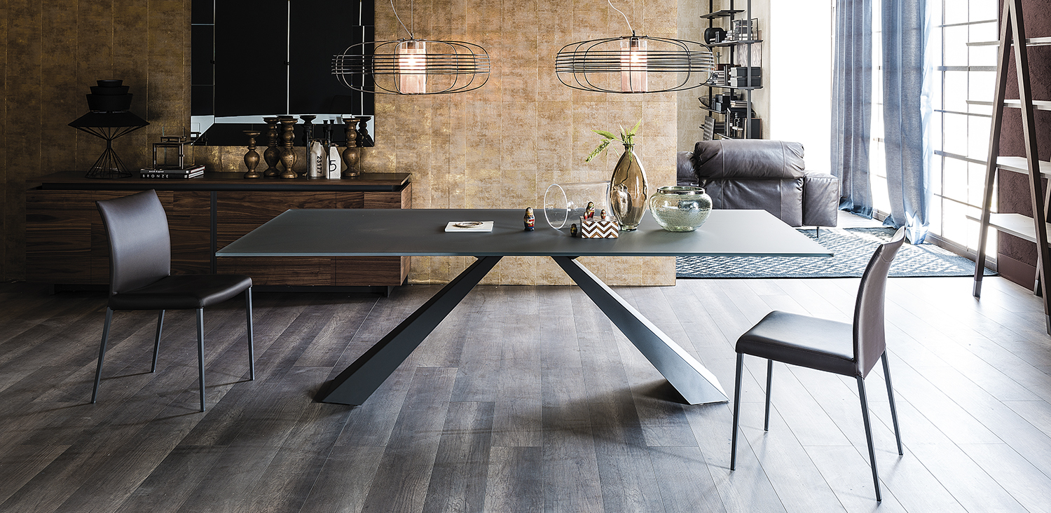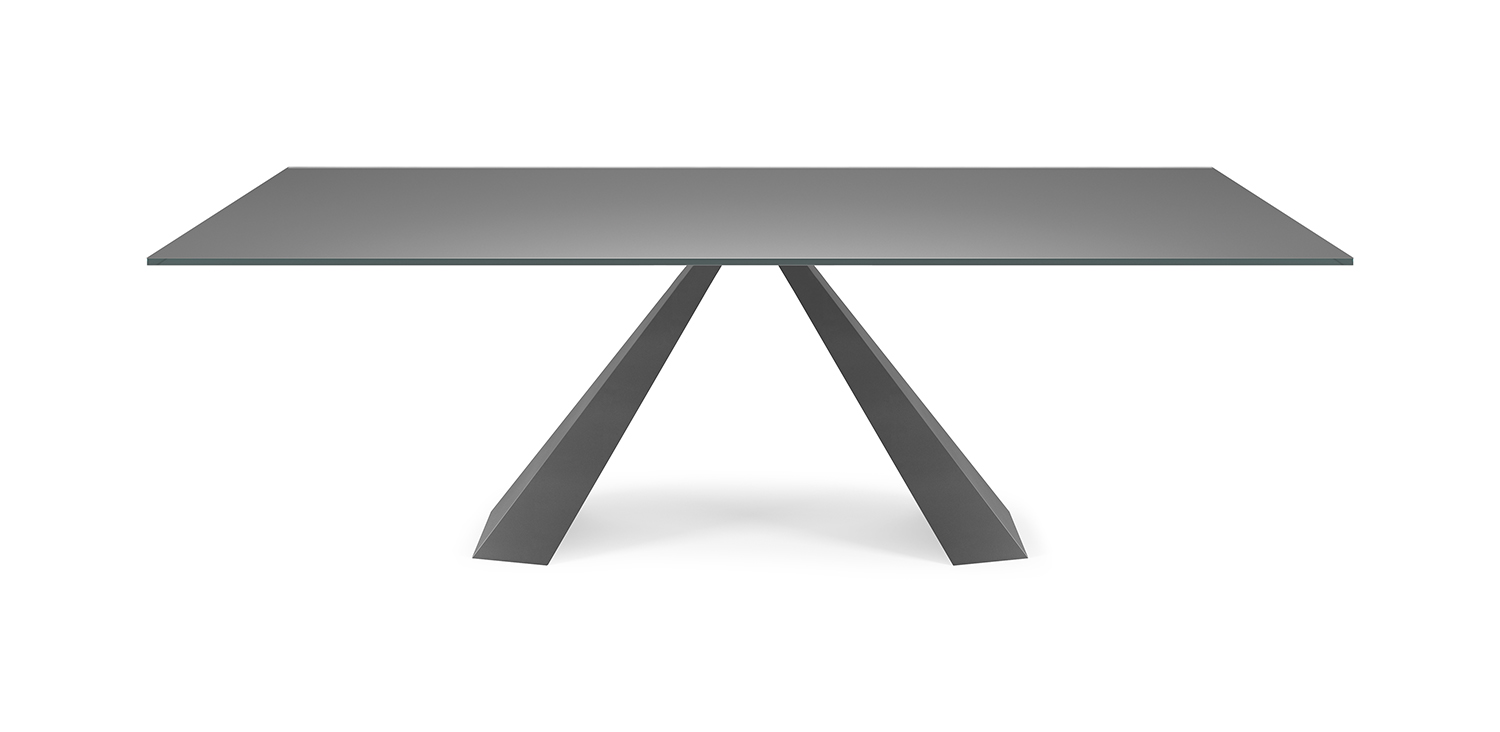 Стіл з основою з титану (GFM11), бронзи (GFM18), графіту (GFM69), білого (GFM71) або чорного (GFM73) тиснення з лакованої сталі. Верх 12 мм із графітового фарбованого матового прозорого скла або білого мармуру Carrara (BC) або Emperador (EMP).Характеристики