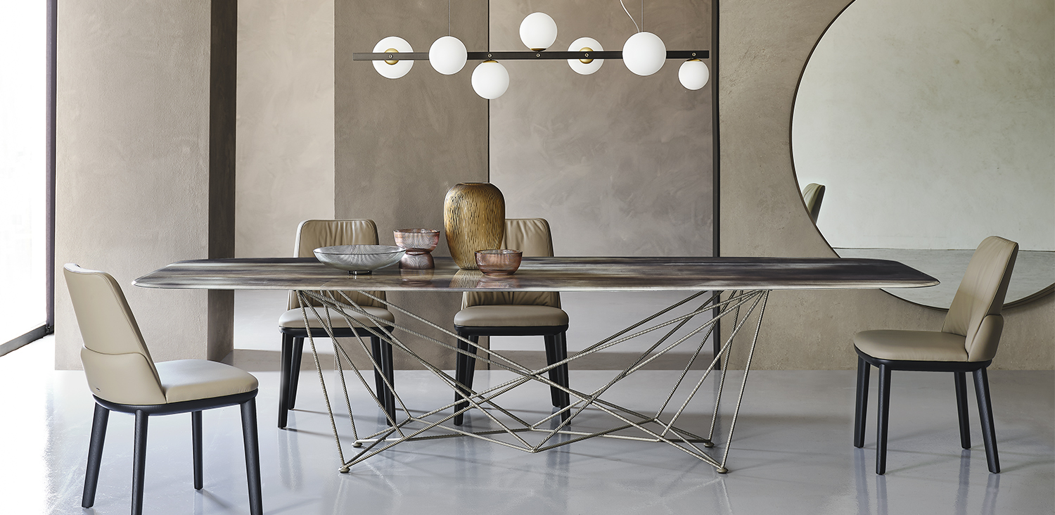 Стіл з титановою (GFM11), графітовою (GFM69), білою (GFM71) або чорною (GFM73) рельєфною основою з лакованої сталі. Верх із тонким скошеним склом товщиною 12 мм із художньо -декоративним друком у двох різних кольорах (CY01, CY02).Характеристики