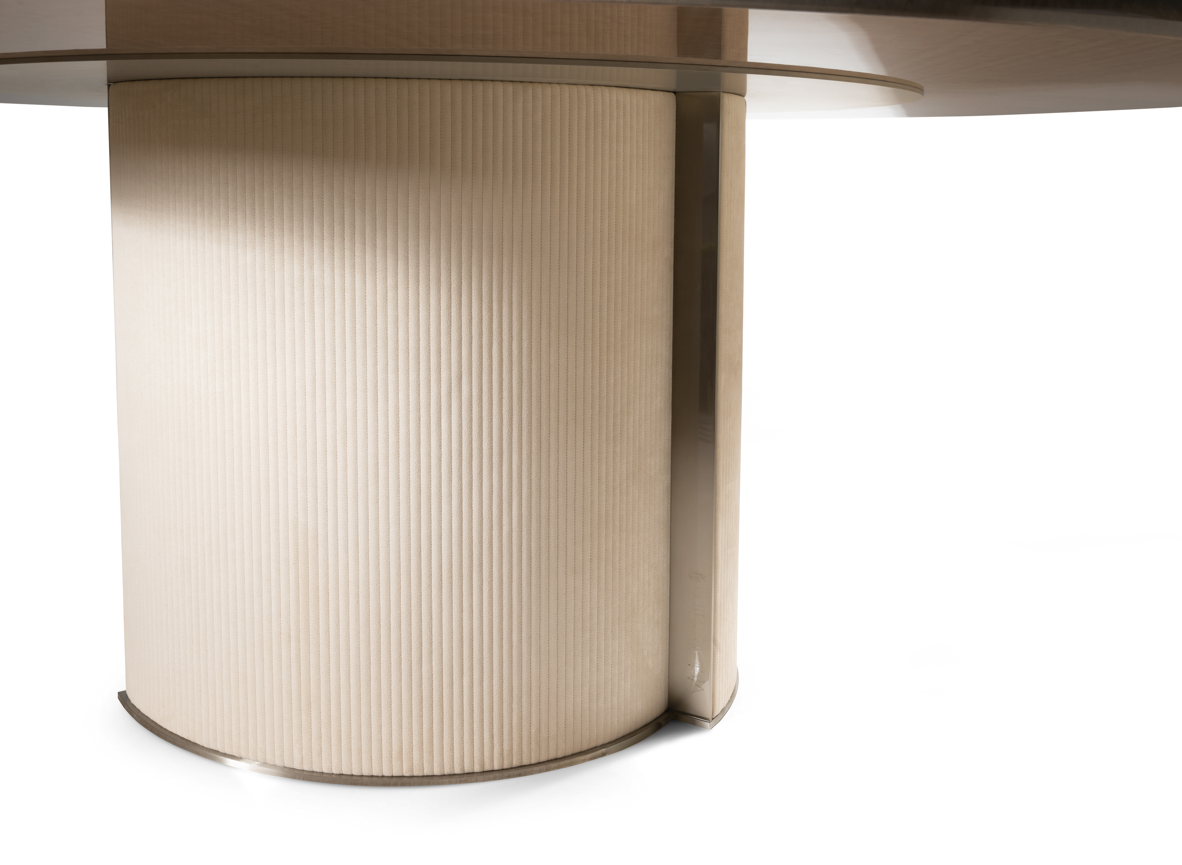 Дерев’яна конструкція з верхом у дереві з шпонованим або глянсовим лакованим покриттям; основа, оббита шкірою або тканиною із стьобаним мотивом каннетте; декоративні профілі та основа з атласної нержавіючої сталі з гравірованим логотипом Visionnaire. Нижня поверхня з лакованого алюмінію. Зверху йде три декоративні пластини по краю. Необов’язковий обертовий піднос для подачі “Ледача Сьюзан”, який можна поставити зверху на столі. Дерев'яні деталі можна обробити будь-яким із шпону деревини, що входить до складу обробки шпоном. Металеві деталі можна обробити будь-яким з лаків, що входять до вибору металевої обробки.Характеристики