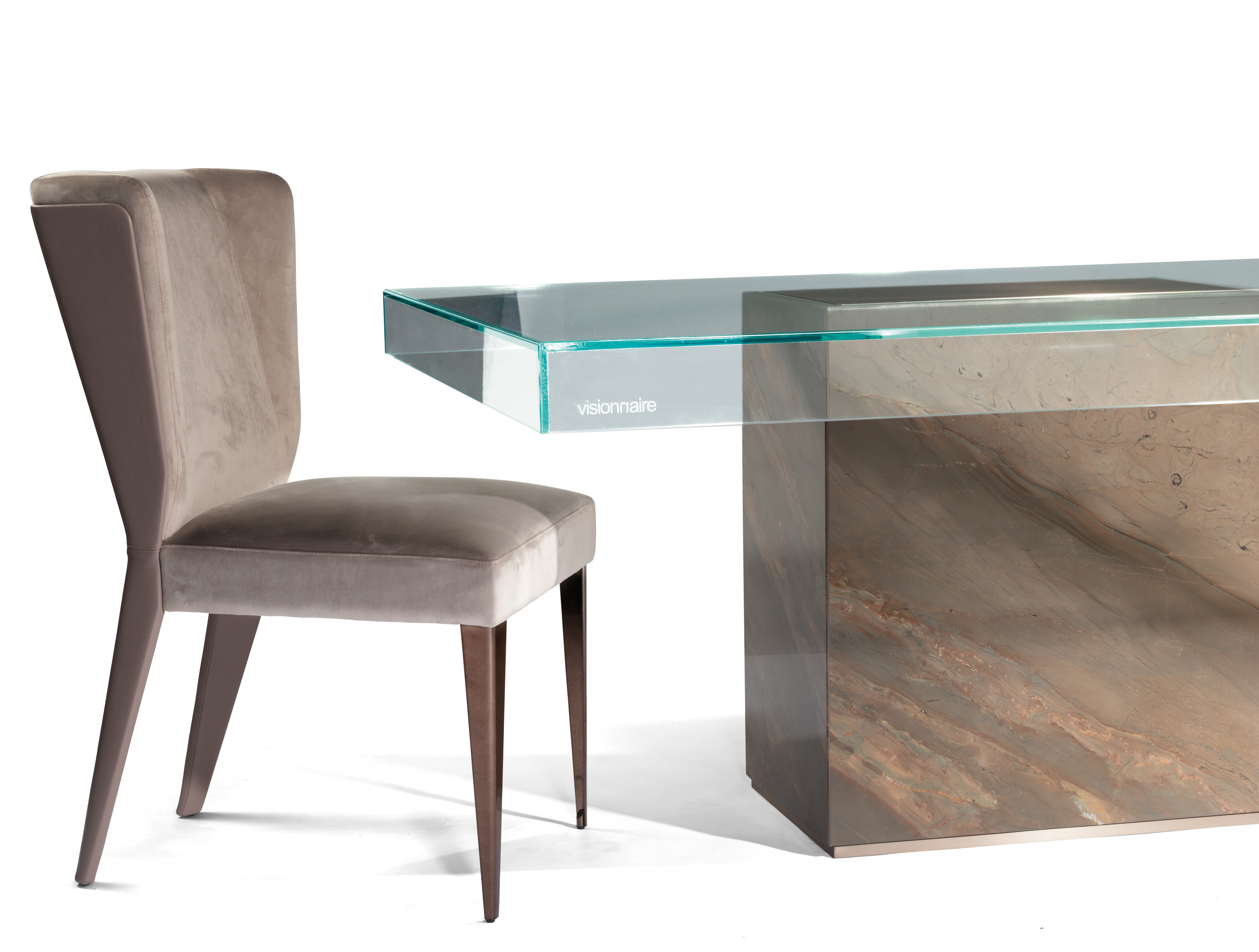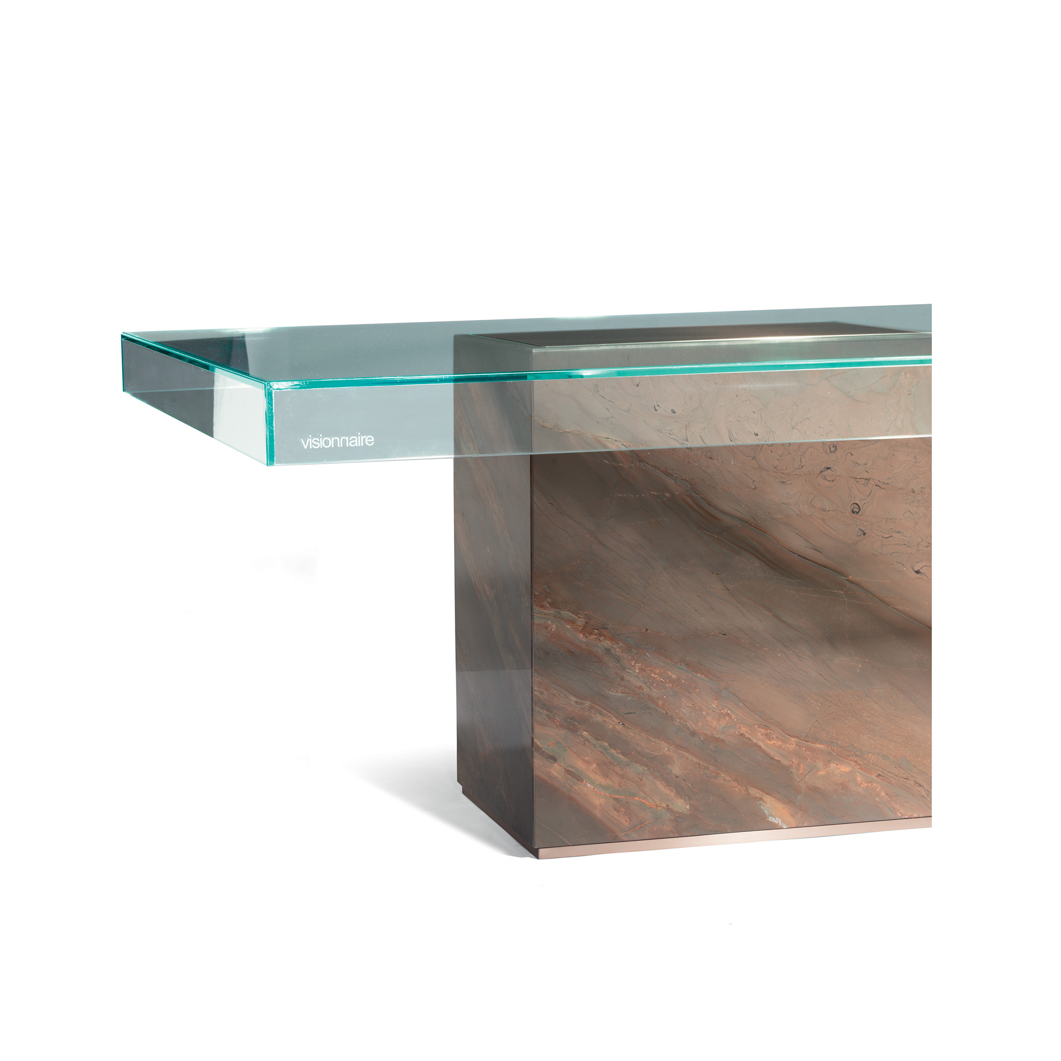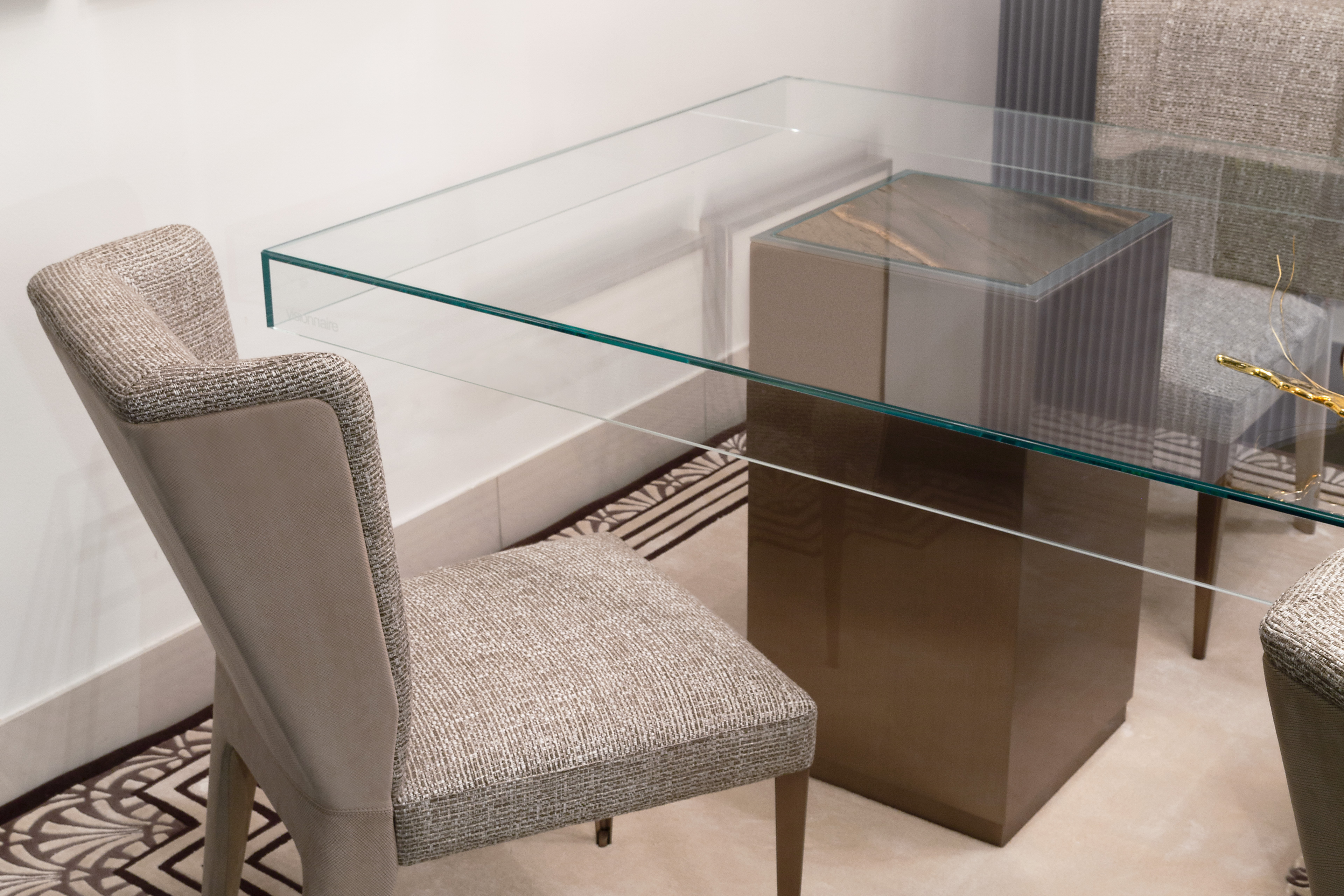 Обідній стіл. Верх у прозорому прозорому склі у формі коробки - товщиною 12 мм - прикріплений до вертикальних профілів за допомогою клею, затверділого ультрафіолетовим світлом. Основа, що складається з двох стовпів у формі коробки, розташованих між стільницею та боками, покритих мармуром та атласною сталлю, з кришками з мармуру та сталі, прикріплених у скляну поверхню. Металеві компоненти можуть бути оброблені будь-яким лаком з вибору обробки металевим лаком.Характеристики