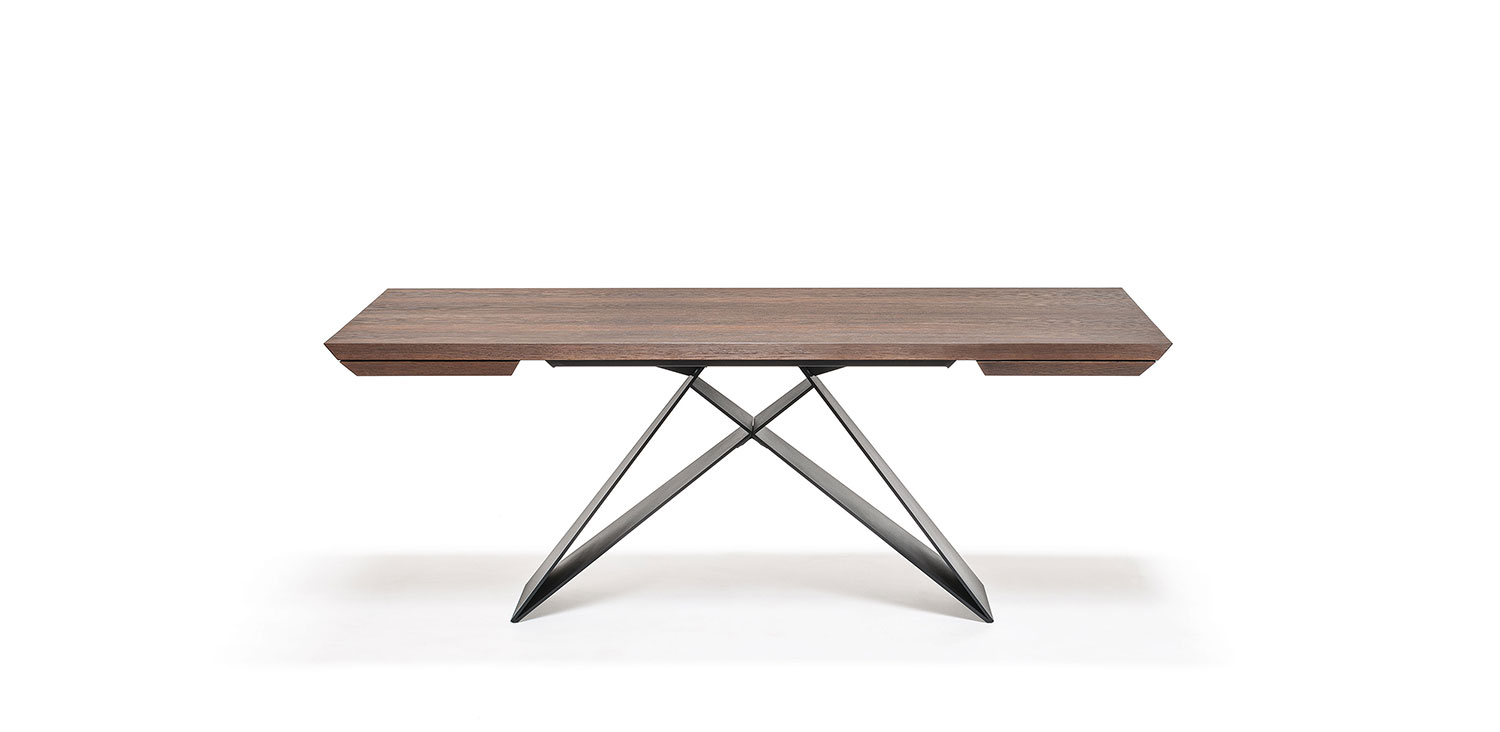 Розсувний стіл з основою з титану (GFM11), бронзи (GFM18), графіту (GFM69) або чорного (GFM73) тиснення з лакованої сталі. Верх і подовження з кутовими краями в горіху Каналетто (NC) або обпаленому дубі (RB).Характеристики