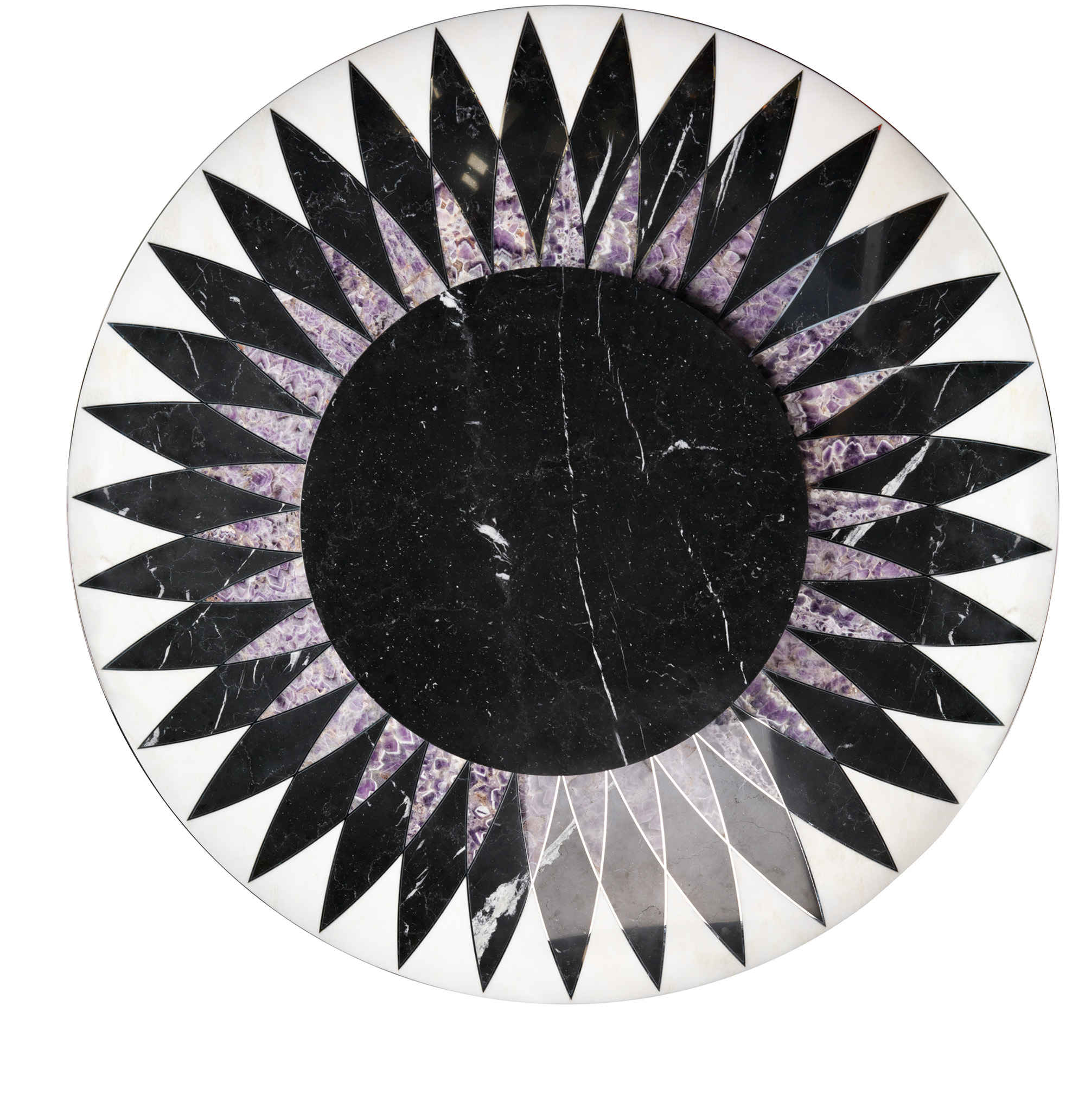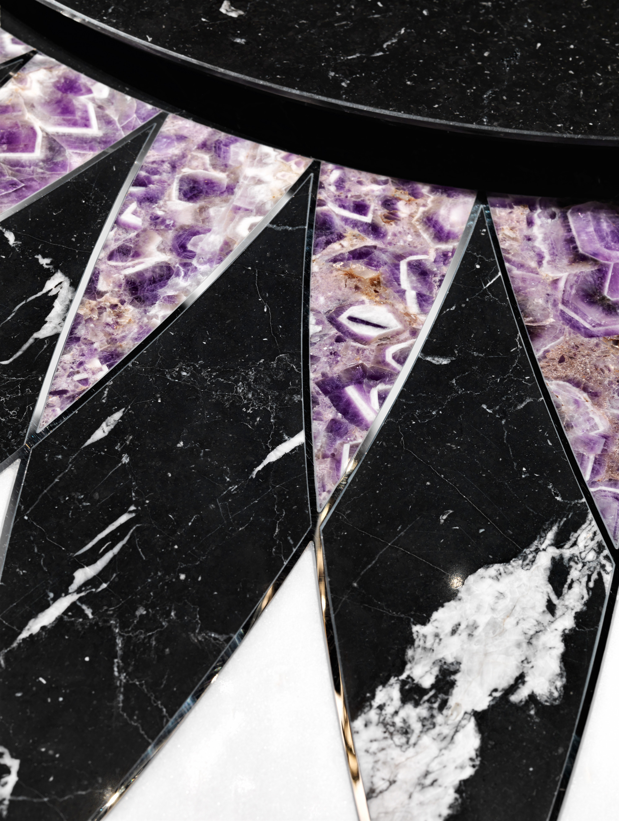 Верх з інкрустацією мармуром та аметистом з дизайном у білих тонах Mistery White, Black Marquina, Purple Amethyst та хромованою обробкою з нержавіючої сталі 3 мм. Верхня рама з нержавіючої сталі з геометричним оздобленням, отримана за допомогою різних процедур полірування та щітки ручної роботи. Зверху точена лакована полірована 100 глянцева деревина (кольори RAL). Основа, складена конічною колонкою на хромованій металевій основі. Центральна опора та баласт під основою з пофарбованого заліза. Можливо декілька комбінацій. Верхній профіль у хромованій обробці. Деталі з недорогоцінних металів доступні в обробці золотом, бронзою та чорним нікелем. Ледача Сьюзан з мармуру із захисною кромкою та системою обертової ваги.Характеристики