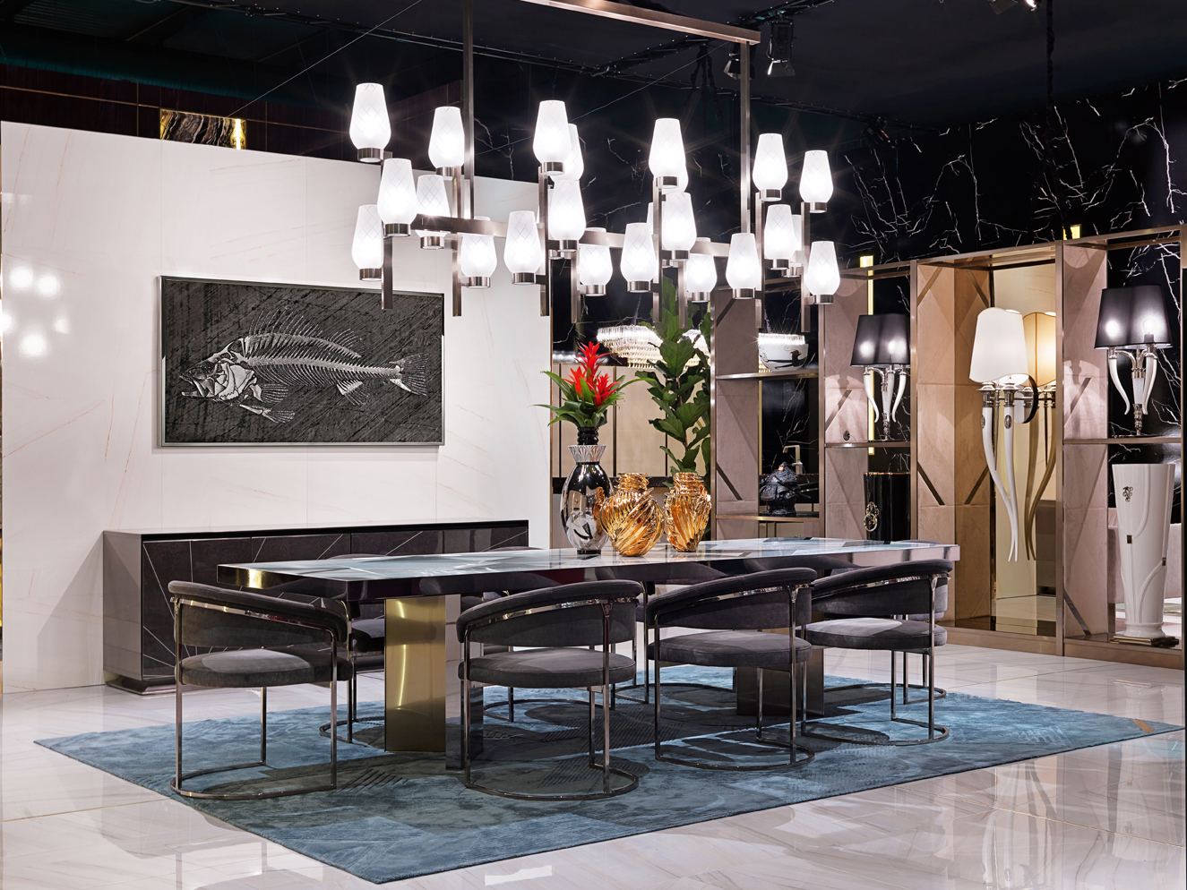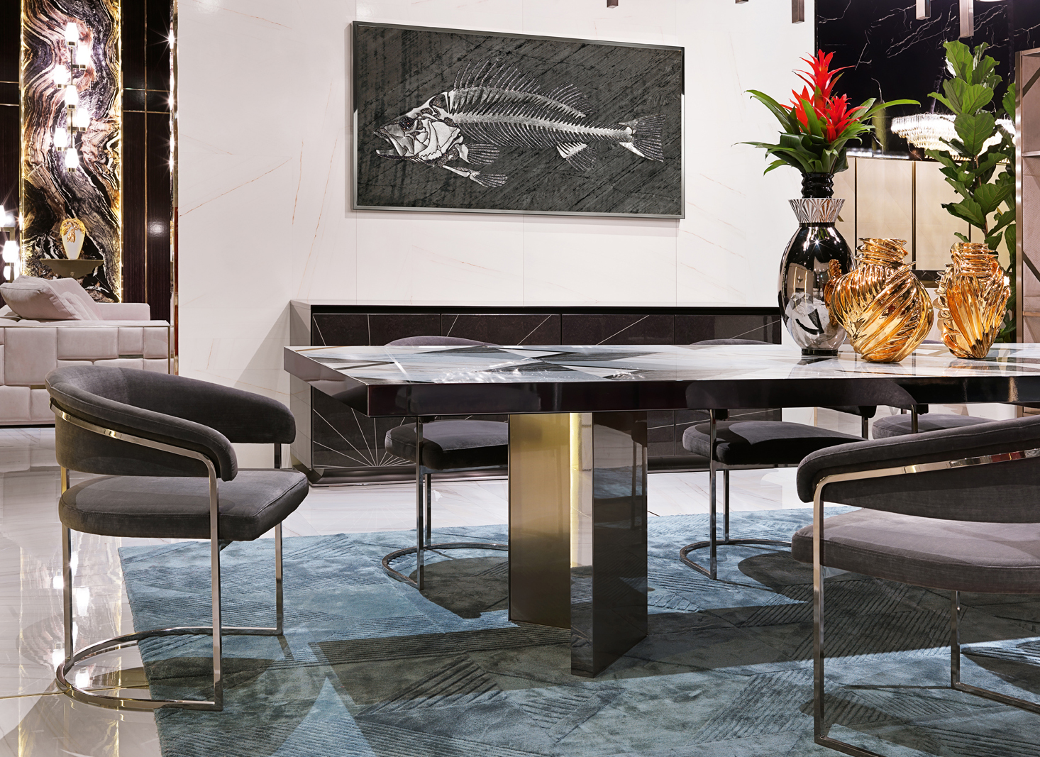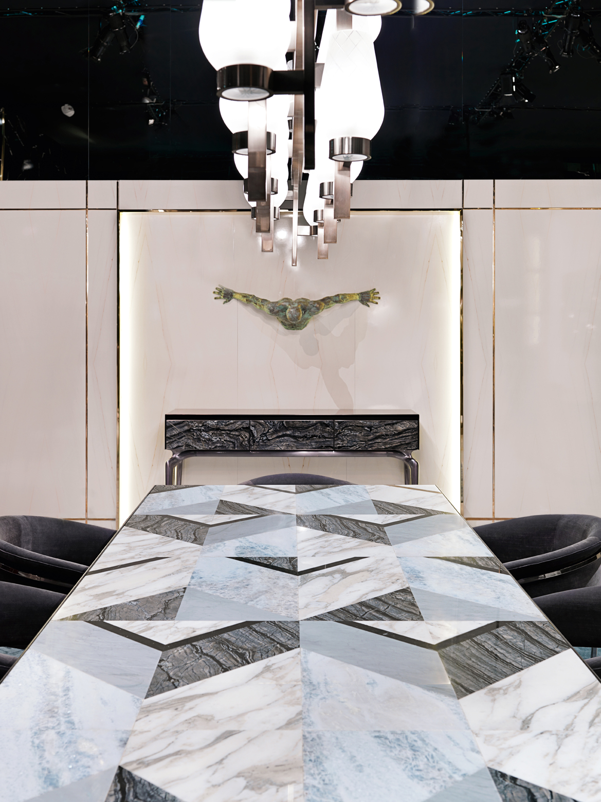 Обідній стіл з мармуровою мозаїкою з кальциту Azul Extra, Silverwave, Marquinia Black, Arabescato Vagli та Bardiglio Imperial Grey, що створює геометричний малюнок. Монолітний периметральний профіль верху з полірованої нержавіючої сталі, шириною 5 мм, з основною структурою з лакованого заліза. Основа складається з 2 коробчастих конструкцій з сатинованої сталі з полірованими краями. Сталеві деталі доступні також з обробкою золотом, шампанським, бронзою, Сієною, чорним нікелем та металевим металом. Полірована сталь верхнього профілю та ніжок також доступна у фарбі, що контрастує з кольором основної сатинованої структури ніжок. Випускається також з різними однорідними комбінаціями мармуру, оніксу або гранітів.Характеристики