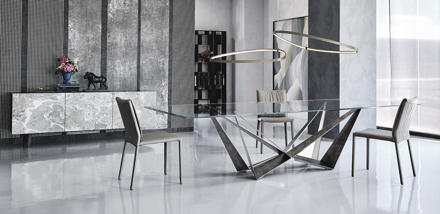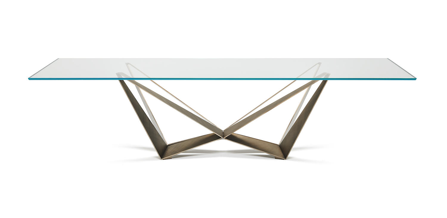 Стіл з основою з титану (GFM11), бронзи (GFM18), графіту (GFM69), білої (GFM71) або чорної (GFM73) рельєфної лакованої сталі, лакованої сталі з матовою бронзою або матовою сірою. Верх із прозорого, надзвичайно прозорого або надзвичайно прозорого скла 15 мм зі зміненими скошеними краями. Скляна поверхня 12 мм у версіях 160x90, 182x90 та 200x106. Верх укладається на основу.Характеристики