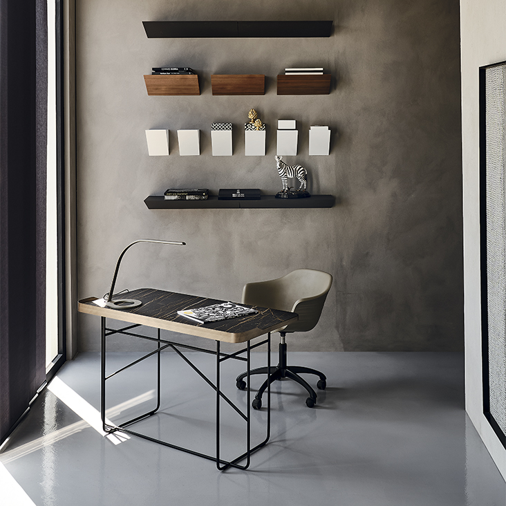 Стіл з основою та верхньою рамою з титанової (GFM11) або чорної (GFM73) рельєфної лакованої сталі, або з основою у чорній (GFM73) рельєфній лакованій сталі та верхній рамі з матової бронзи. Верх з кераміки Marmi Alabastro (KM02), Supreme (KM03), Ardesia (KM04), матова Золота Калакатта (KM05), глянсова Золота Калакатта (KM06), матова Порторо (KM07), глянсова Порторо (KM08), глянцева Сахара Нуар (KM09) ), Emperador (KM10), Makalu (KM11), Breccia (KM12) або Arenal (KM13).Характеристики