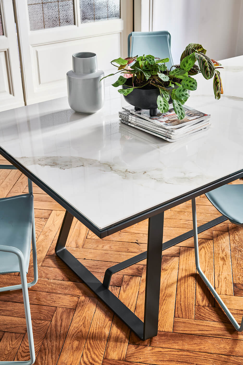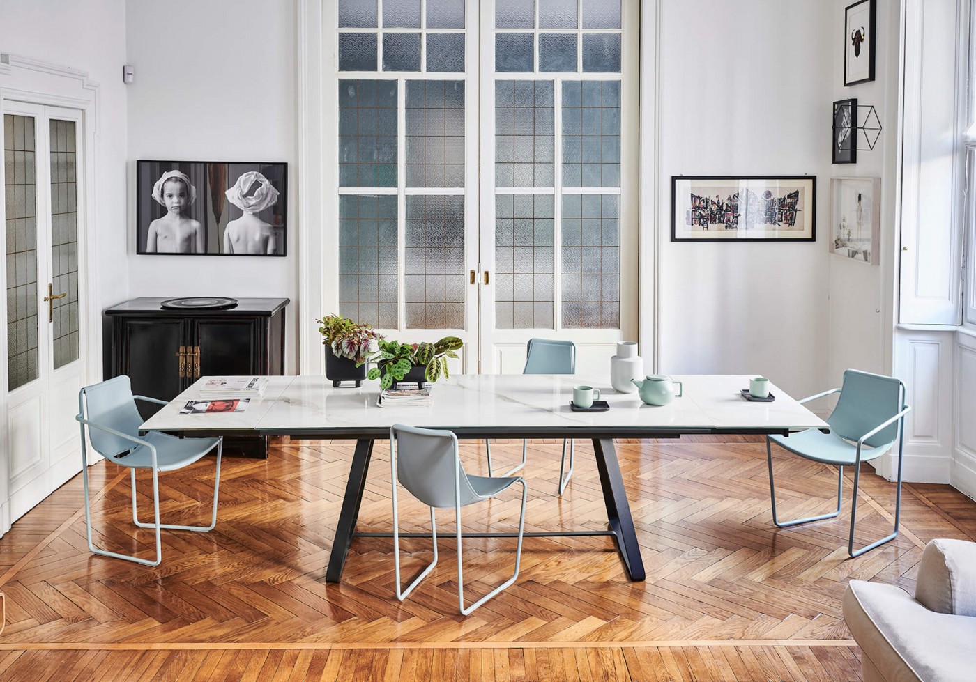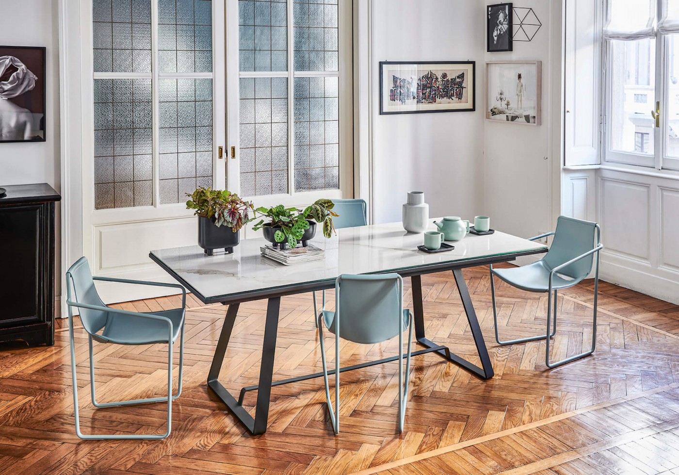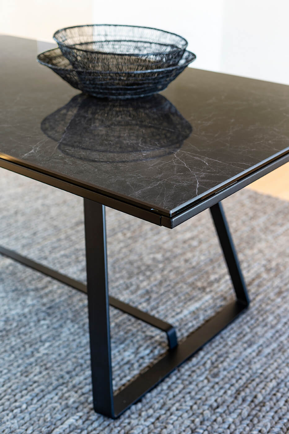 Розширюваний стіл з підставкою для саней з лакованої сталі. Зверху в кришталевому керамічному або антискриттичному скла.Характеристики