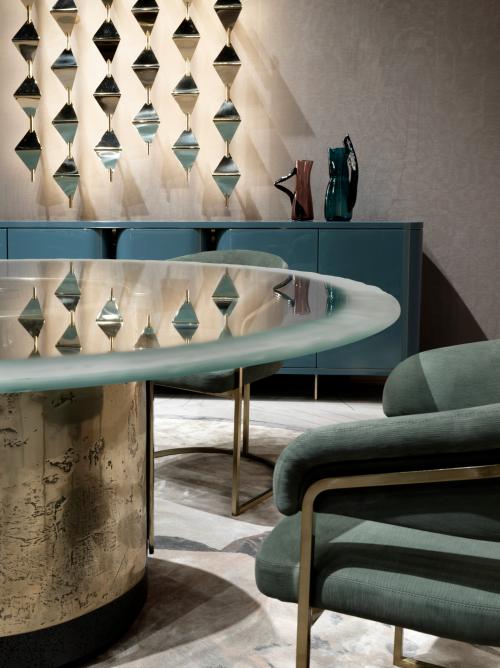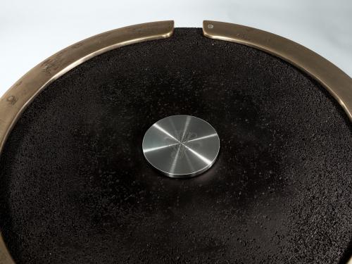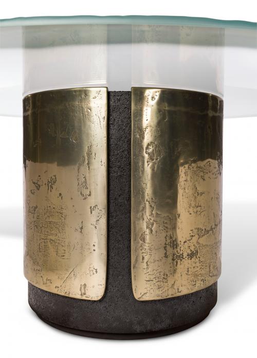 Основна конструкція з литого бетону та полірованого алюмінію з ручною обробкою та пігментацією поверхні. Збройна бетонна частина зроблена ще більше матеріалом завдяки ексклюзивній обробці ерозії та матовому чорному кольорі. Верх у надпрозорому склі товщиною 20 мм, заземлений та відшліфований вручну за допомогою техніки аерографа, оброблений захисними засобами проти плям Алюмінієві елементи можуть бути лаковані в будь-який колір, що входить до вибору металевої обробки. Вага 200 кг.Характеристики