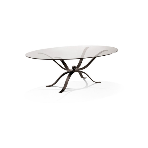 Скляний стіл з атланта з круглою, овальною або прямокутною верхівкою та залізною основою. Скляна поверхня доступна у прозорому або бронзовому склі зі шліфованим або полірованим краєм. Несуча конструкція, виготовлена із твердого заліза, конічна, холодно вигнута та полірована вручну.Характеристики
