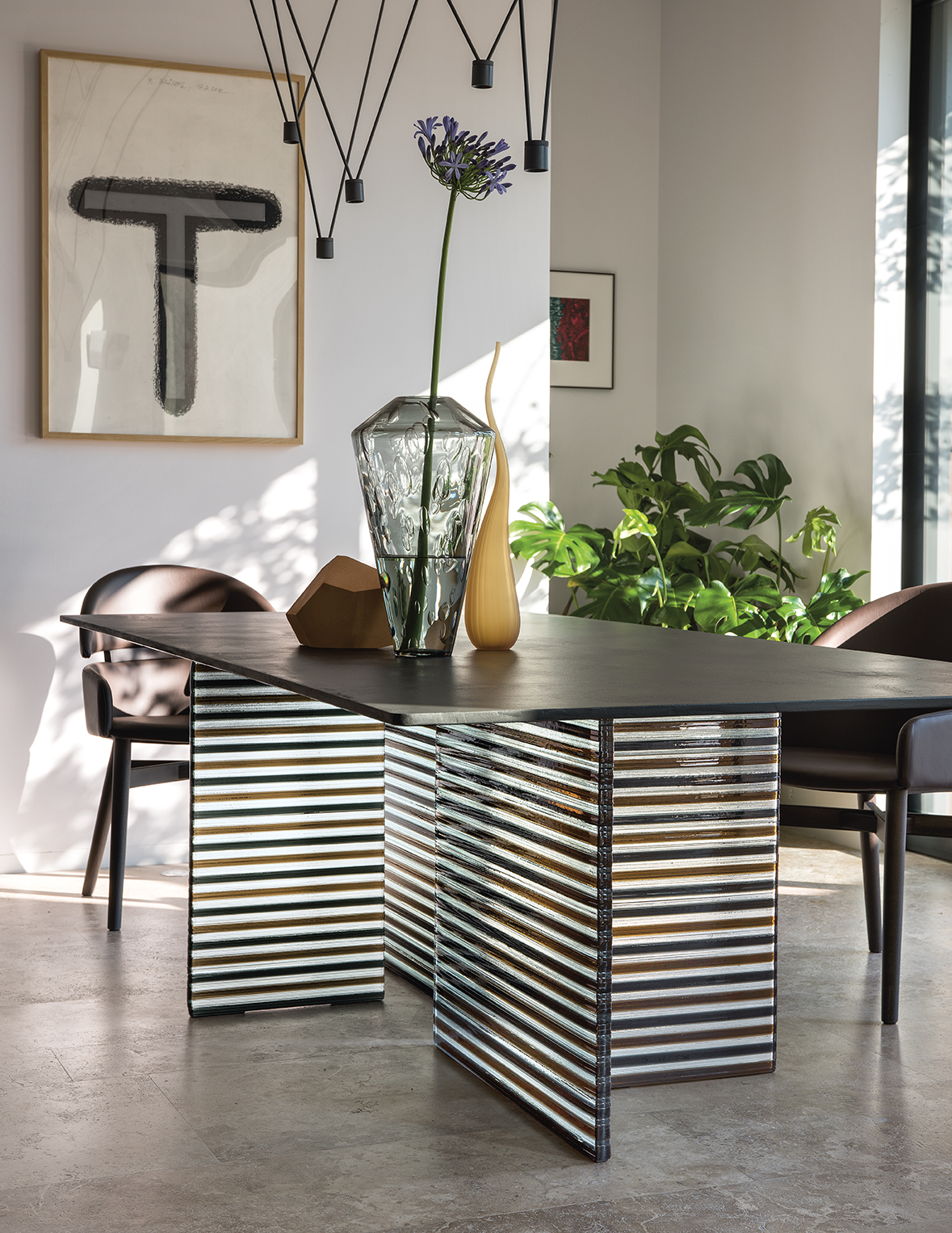 Стіл з підставою з чотирьох окремих 30-міліметрових скляних елементів DV, прозорий або з кольоровими смугами. Верх виготовлений з прозорого скла 15 мм, покритий лаком з монохромним кольором або оброблений вручну Ecomalta, тонкозерниста текстура.Характеристики
