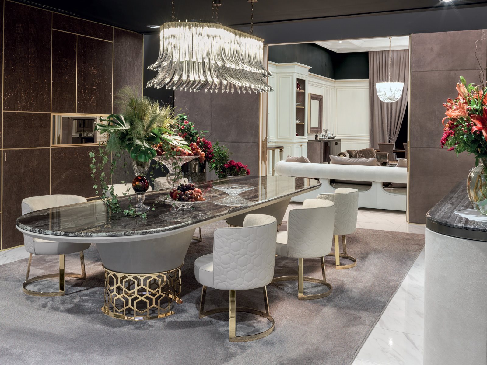 Стіл з основою, сформований із шліфованого лазерного різаного металу з вигнутим декором “Sequence” Каркас покритий зразком шкіри. Структура обробки: золото чорного троянди, яскраво відтінене коричневе, яскраве світле золото, матове шампанське золото, яскравий хром, яскраво-чорний хром, матова атласна бронза, яскраво-рожеве золото, матове рожеве золото. Верхнє покриття: бронзове або димчасте дзеркало 6 мм зі скосом, мармур. мм 20 зі скосом мм 20: мармур Fusion Light, мармур Patagonia, мармур Explosion Blu, багатофункціональний мармур Fusion, кварцовий мармур Джульєтта, мармур Sahara Noir (поліефірне покриття), мармур Dover White, мармур Panda White, мармур Gvatemala Green, мармур Corteccia, порт Мармур Сен-Лоран, червоний мармур Леванто, мармур Бардильо Нуволато, елегантний коричневий мармур, мармур із сланцевого палисандру, темний мармур Emperador, мармур Silver Wave, чорний мармур Агати, мармур Frappuccino, мармур золота Калакатта. Для круглого столу доступний обертовий піддон (см Ø 75-90-110), який можна встановити на стільницю в оздобленні: кришталеве скло, пофарбоване в чорний колір, бронзове або димчасте дзеркало, глянсове лаковане дерево в різноманітних кольорах, глянсове / матове чорне дерево , глянсовий / матовий явір фрізе, глянсовий / матовий волоський горіх Canaletto, глянцевий горіховий дерево, мармур, у тих самих варіантах, зазначених у каталозі. Дерев’яна верхівка товщиною 5 см із відповідним центральним поглибленням у обробці: матове чорне дерево, матове сикаморське фрізе, матове горіх КаналеттоХарактеристики