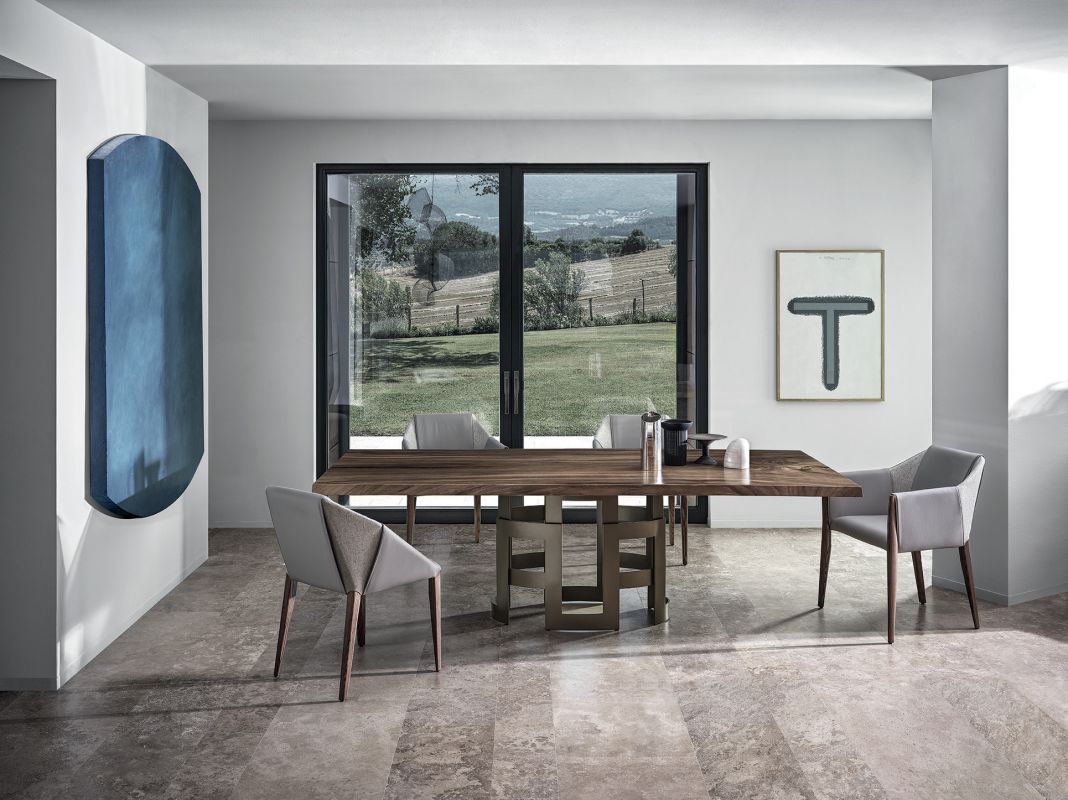 Стіл з еліптичною, прямокутною або прямокутною поверхнею, фіксованою або з витяжками, з деревини шпону, шпону з суцільним краєм, масиву з натуральним краєм, глянцевого скла, матового оксамитового матового лакованого скла, SuperCeramic, SuperMarble або натурального мармуру. Лакований металевий браслет у формі рами.Характеристики