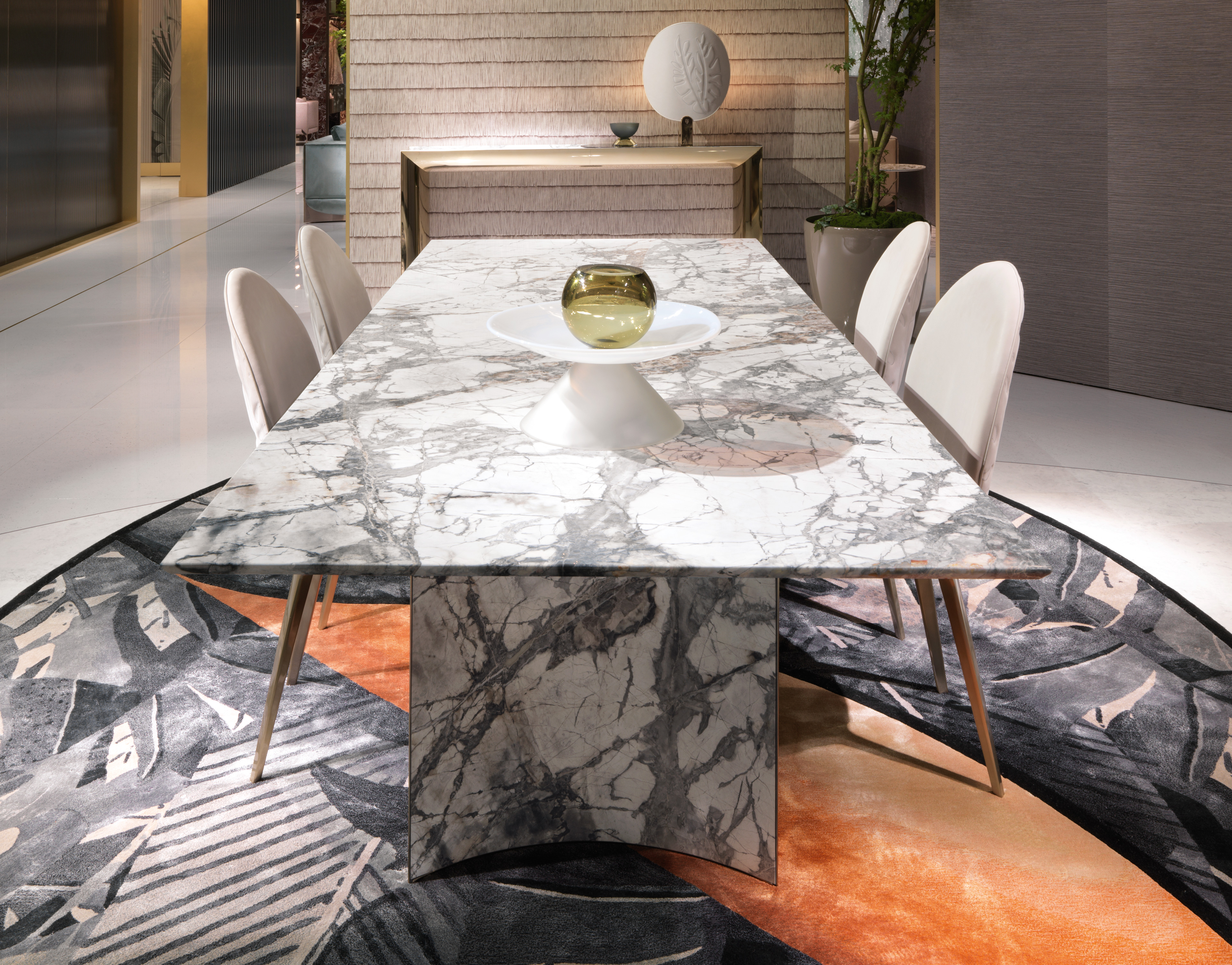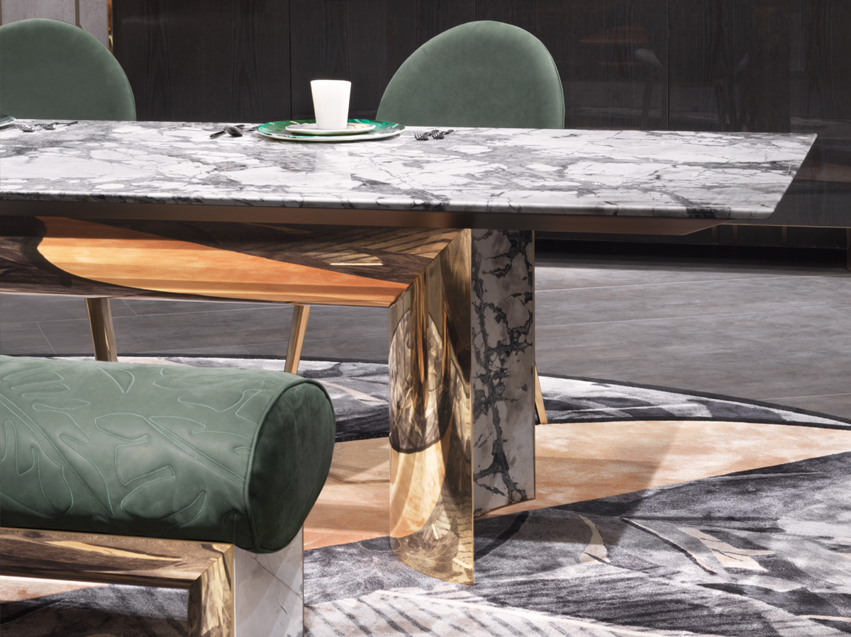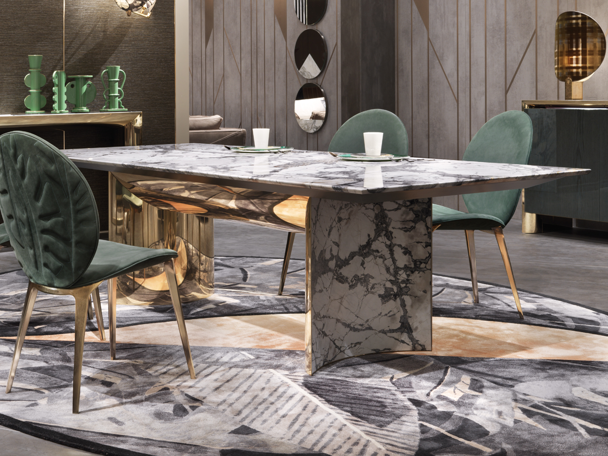 Обідній стіл, поверхня з мармуру зі скошеним краєм і під дошкою з лакованого дерева. Полірована та вигнута основа з нержавіючої сталі з увігнутими зовнішніми поверхнями з криволінійного та полірованого мармуру. Металеві деталі доступні у виборі металевої обробки. Також доступний у варіанті шпону з верхніми та увігнутими дерев'яними поверхнями, покритими матеріалами обробки шпону.Характеристики