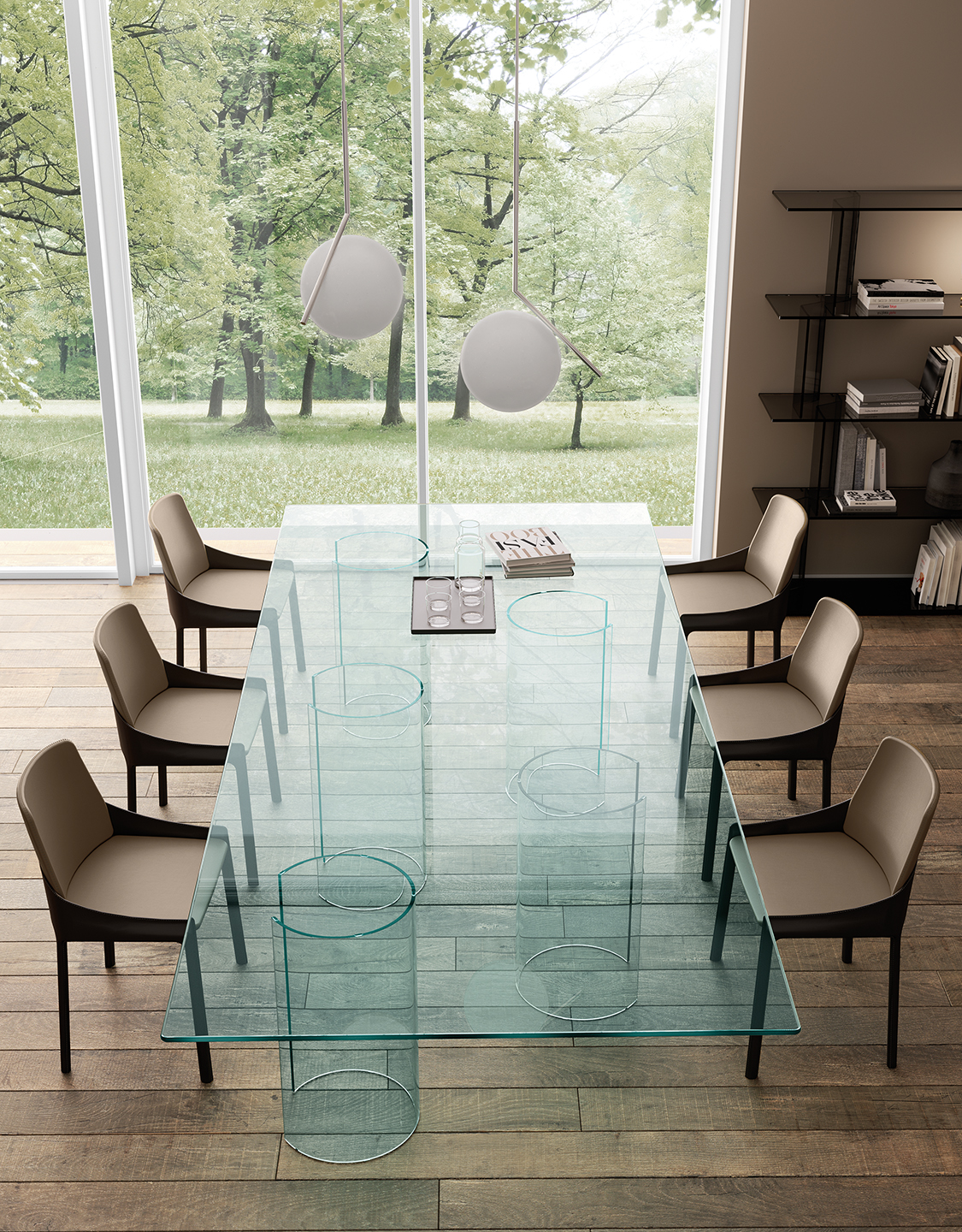 Обідній стіл із шаруватою скляною стільницею блискучим полірованим обідком товщиною 8 + 8 мм, у копченому або бронзовому склі, також доступний у прозорому склі або надлегкому склі. Вигнута скляна основа товщиною 10 мм, що складається з 2, 3 або 4 циліндрів (Ø 40 см) залежно від розміру та форми, що вимагається. Основи доступні в копченому склі, бронзовому склі, прозорому склі або надсвітлому склі. Також доступний з вершинами під замовлення.Характеристики