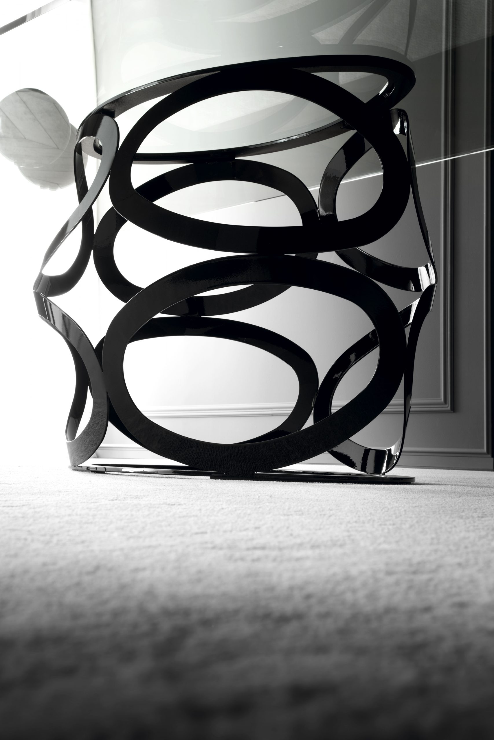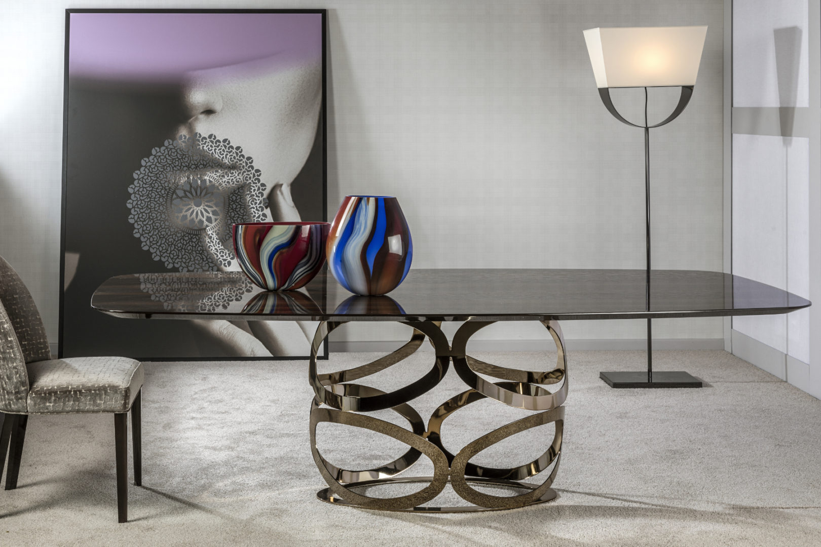 Ікона - це виразний фрагмент з виразною основою з елегантно переплетених блискучих сталевих еліпсів під різними кутами в чуттєвому золоченому бронзовому кольорі, який підкреслює відбите світло. Витончена елегантність цього приголомшливо виліпленого столу надзвичайної легкості та інтригуючої прозорості привертає увагу. Тонкий верх з ніжно закругленими кутами доступний у мармурі, дереві або склі. Ікона доступна у 2 стандартних розмірах, 240 × 120 см для мармуру та 250 × 128 см для дерева.Характеристики