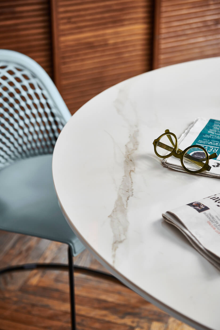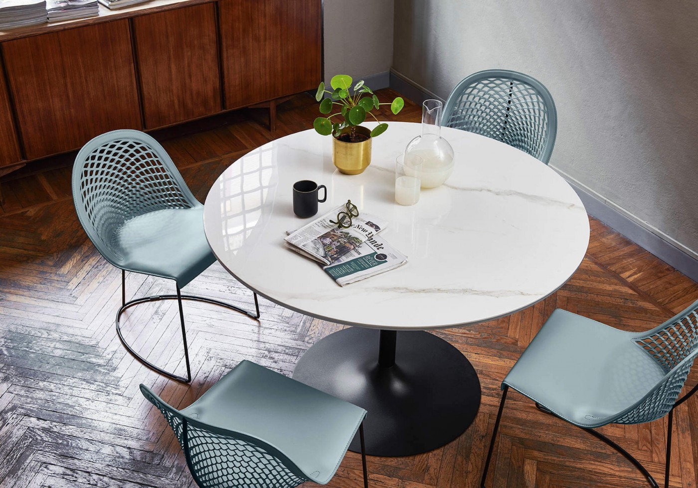 Стіл з круглою основою з хромованої або лакованої сталі. Скло, меламін, кришталево-керамічна поверхня, доступні в різних розмірах. Верх ø120 доступний лише з меламіну, скла та кристалокерамічної мармурової калакатти.Характеристики