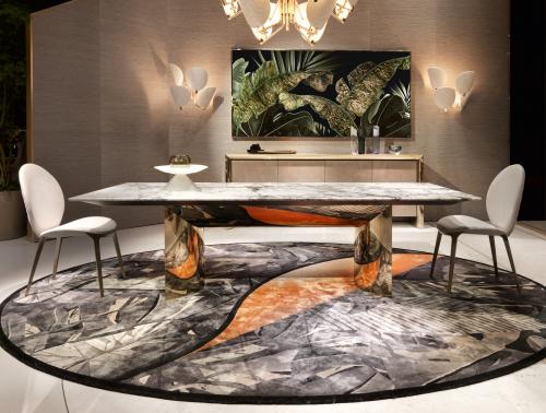 Обідній стіл, поверхня з мармуру зі скошеним краєм і під дошкою з лакованого дерева. Полірована та вигнута основа з нержавіючої сталі з увігнутими зовнішніми поверхнями з криволінійного та полірованого мармуру. Металеві деталі доступні у виборі обробки металу. Також доступний у варіанті шпону з верхніми та увігнутими дерев'яними поверхнями, покритими матеріалами обробки шпону.Характеристики