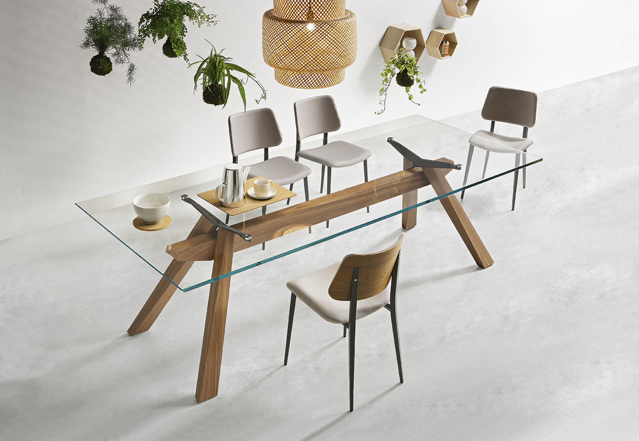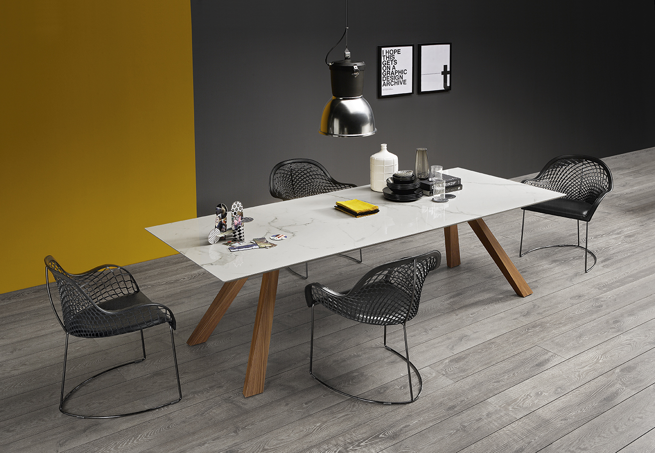 Нерухомий стіл з дерев'яною конструкцією. Верх доступний у кристалічній кераміці розміром 200x100 см (78,7x39,4 дюйма) та 250x100 см (98,4x39,4 дюйма), з дерева розміром 200x106 см (78,7x41,7 дюйма) та 250x106 см (98,4x41, 7 дюймів), у склі розміром 200x106 см (78,7x41,7 дюйма) та 250x106 см (98,4x41,7 дюйма).Характеристики