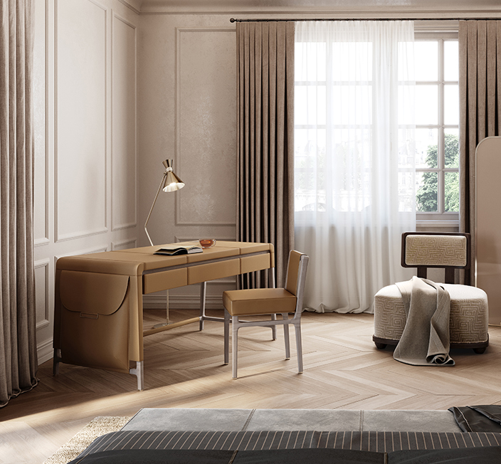 Письмовий стіл з рамою з твердої деревини. Верх і ноги, покриті шкірою. Бічна кадрі кишеню шкіри з металевим закриттям. Ящики з передньою покритою шкірою та внутрішнім шкіряним мат. Корпус кабелю на вершині.Характеристики