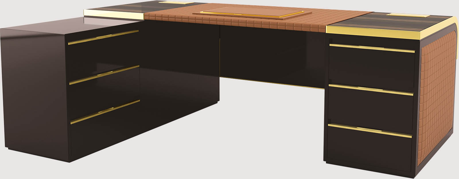 Каркас із масиву дерева, криволінійна фанера та МДФ. Верх доступний з фанерованого шпону макассар. Верх і зовні корпус зі стьобаною шкірою. Металеві деталі та профілі. Багатофункціональний металевий кабельний органайзер. Шкіряна накладка для письмового столу за запитом.Характеристики